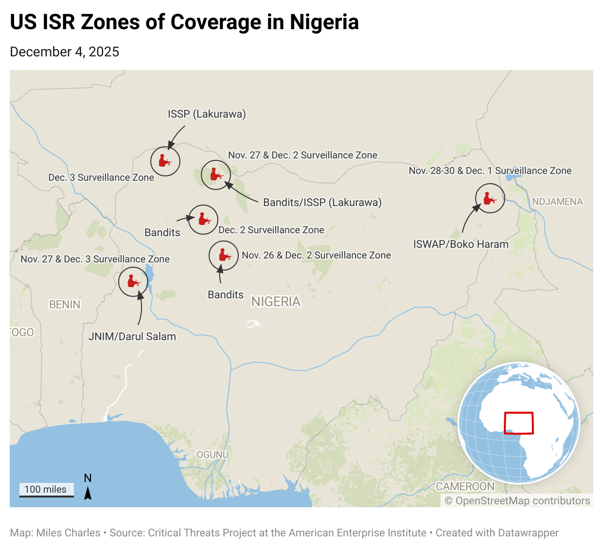 The United States has resumed reconnaissance operations in Nigeria for the first time since withdrawing from Niger in 2024 as part a broader increase in US-Nigeria security cooperation. The United States has conducted intelligence, surveillance, and reconnaissance (ISR) operations over the Lake Chad Basin, along the Benin and Niger borders, and in northwest Nigeria from November 26 to December 3.[cxxiv] The US has surveilled IS West Africa Province (ISWAP), IS Sahel Province, Jama’at Nusrat al Islam wa al Muslimeen, and bandit strongholds in the area, launching operations from Accra, Ghana.[cxxv] The Kotoka International Airport in Accra serves as the central hub for the US Africa Command’s West Africa Logistics Network.[cxxvi] The US contracted Tenax Aerospace, a private US-based aviation company, to conduct the operations.[cxxvii] US forces had been unable to conduct ISR operations since US forces withdrew from Niger in 2024, including Air Base 201 in Agadez, Niger, which hosted US drones.[cxxviii]