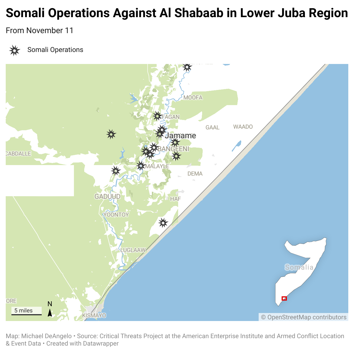 Somali federal government (SFG) and Jubbaland forces have advanced toward a district capital in southern Somalia that al Shabaab has held for 16 years. Somali forces—backed by US air support—have progressed along the Jubba River in Jamame district toward Jamame town since mid-November.[clxxii] Security forces have cleared al Shabaab bases and disrupted the group’s supply lines, including agricultural and taxation operations, as they advance. [clxxiii] The forces reportedly advanced to the Araare bridge by late November, which is located approximately four miles southwest of Jamame town.[clxxiv] Al Shabaab has reportedly bolstered its defenses around the bridge, as SFG and Jubbaland forces must cross the Jubba River to assault the town.[clxxv] Al Shaabab controls much of Jumaame district, and its leaders are based nearby in Middle Juba region, where the group openly governs most of the territory.[clxxvi]
