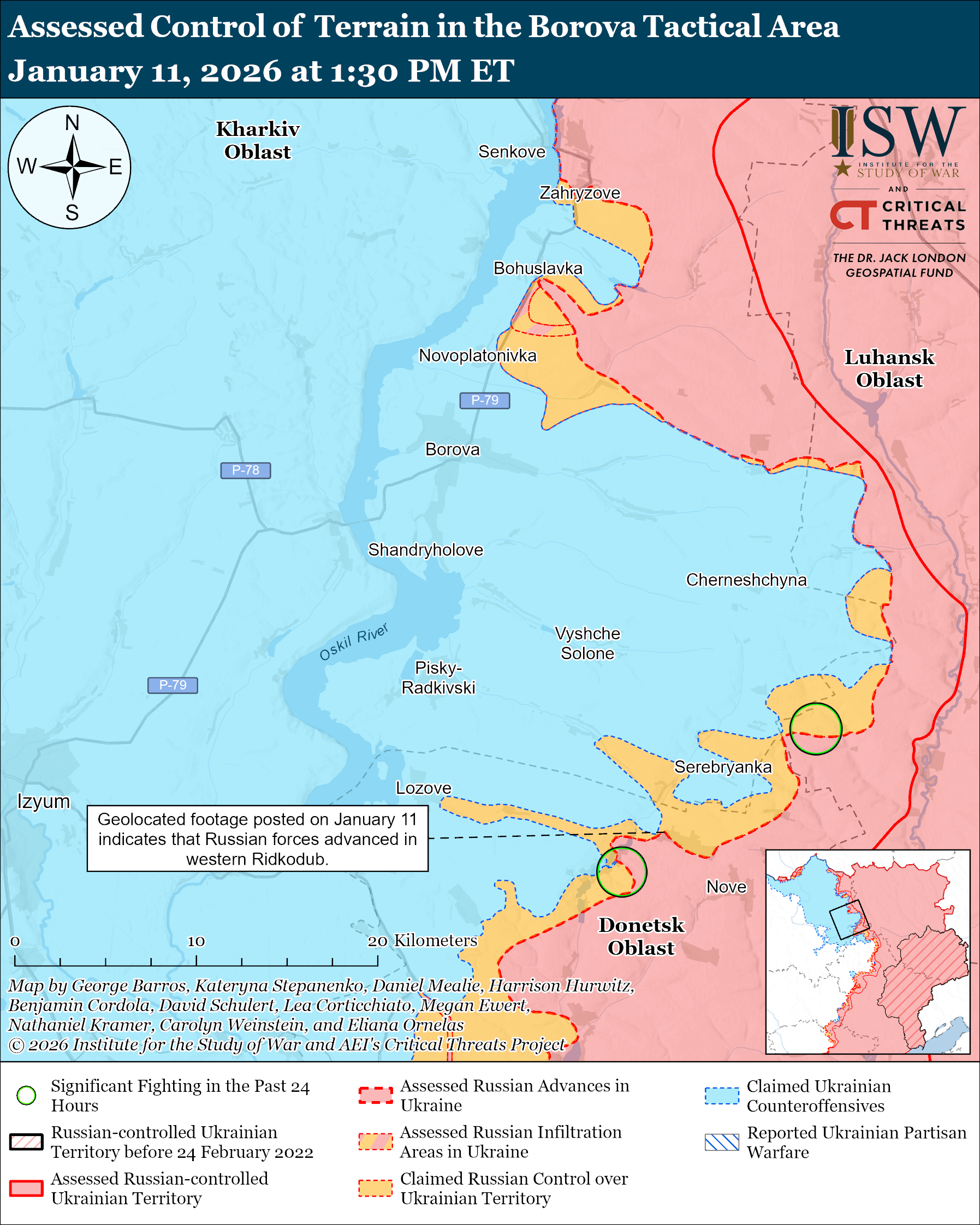 Assessed Russian advance: Geolocated footage published on January 11 indicates that Russian forces recently advanced in western Ridkodub (southeast of Borova).[18]