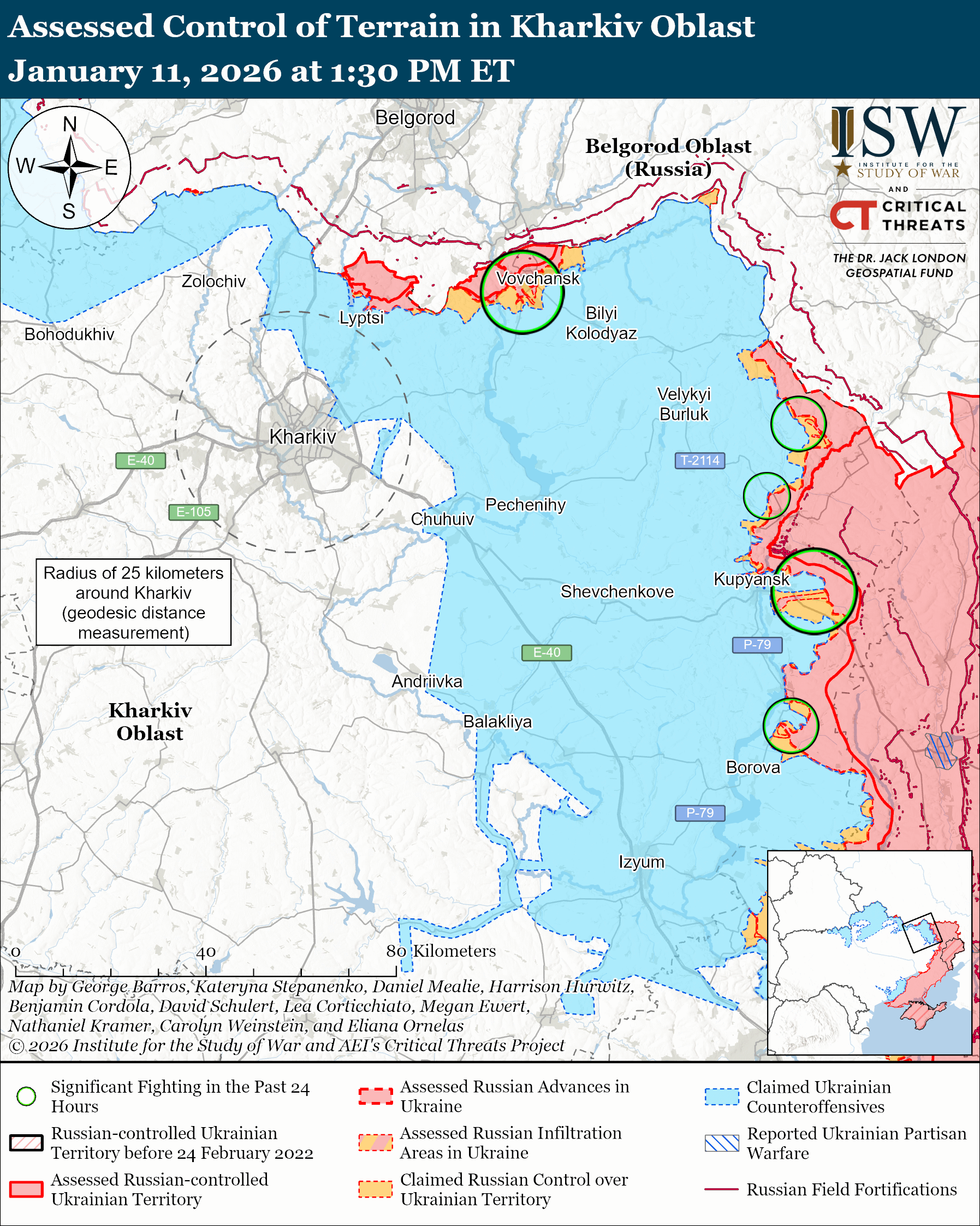 Russian forces continued offensive operations, including southeast of Velykyi Burluk near Dvorichanske and toward Kolodyazne, on January 11 but did not advance.[12]