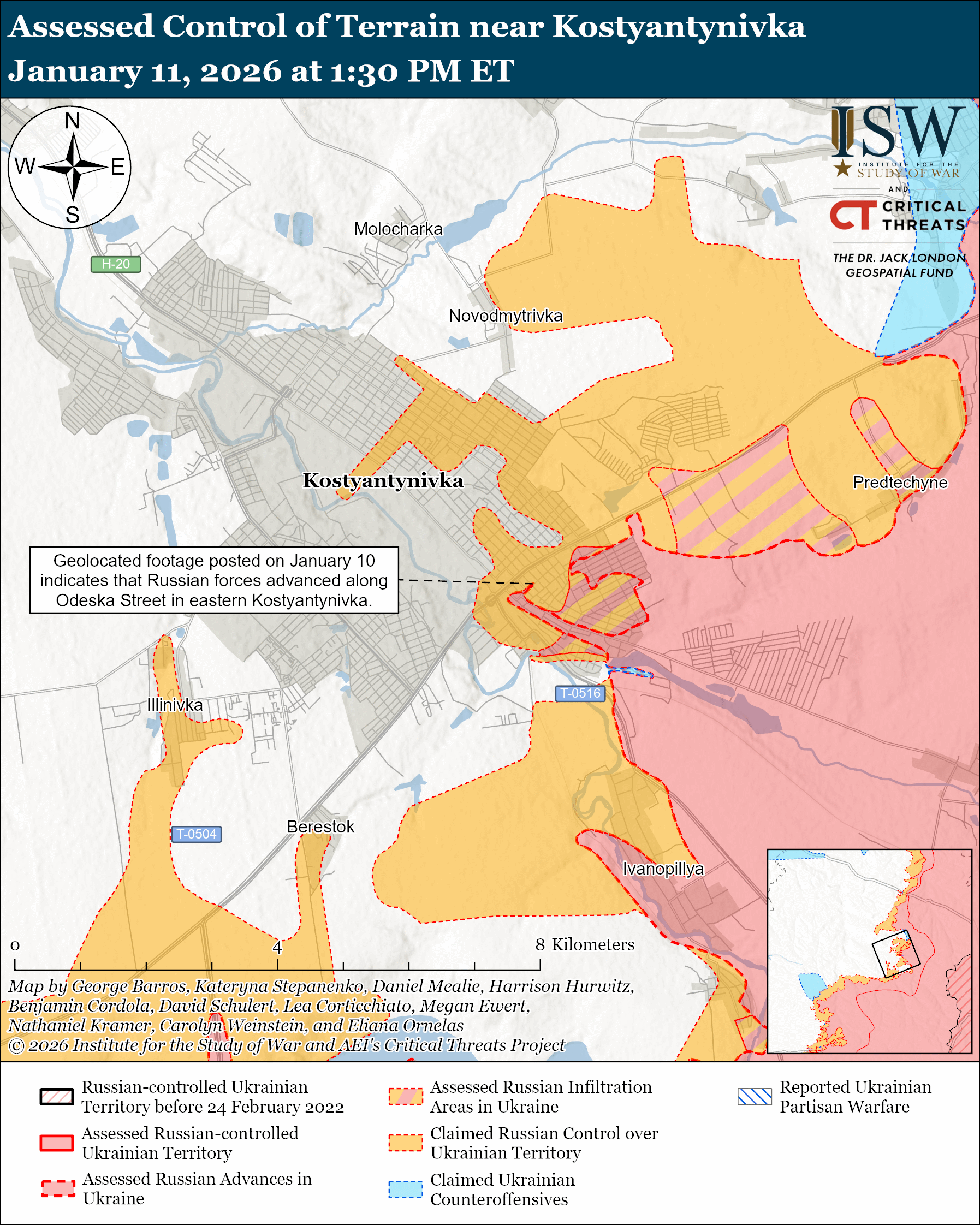 Assessed Russian advances: Geolocated footage published on January 10 indicates that Russian forces recently advanced in eastern Kostyantynivka.[28]