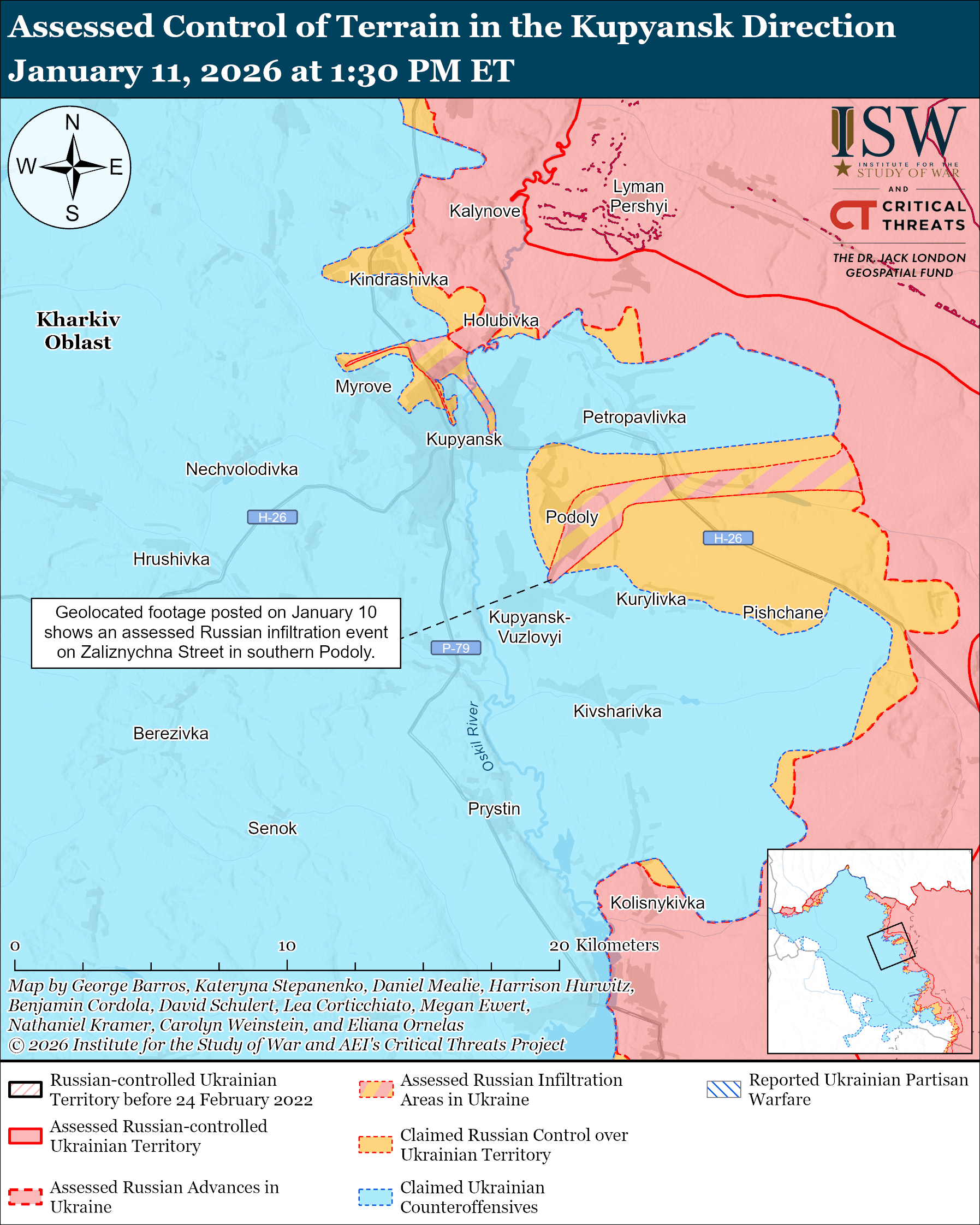 Assessed Russian infiltrations: Geolocated footage published on January 10 shows Russian forces operating in southern Podoly (east of Kupyansk) in what ISW assesses was an infiltration mission that did not change the control of terrain or forward edge of the battle area (FEBA).[13]
