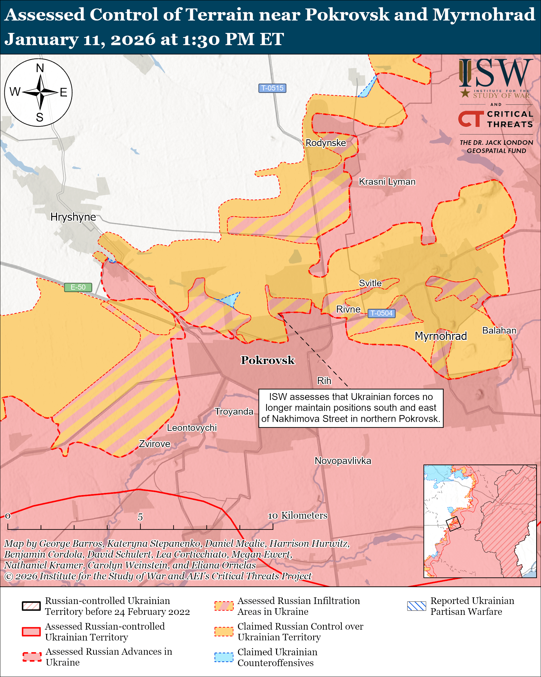 Russian forces attacked near and within Pokrovsk itself; northwest of Pokrovsk near Hryshyne and toward Novooleksandrivka and Serhiivka; north of Pokrovsk near Rodynske; northeast of Pokrovsk near Sukhetske, Zatyshok, Chervonyi (Krasnyi) Lyman and toward Bilytske; east of Pokrovsk near and within Myrnohrad; and southwest of Pokrovsk near Kotlyne, Udachne, and Molodetske on January 10 and 11.[43] Russian milbloggers claimed that Ukrainian forces counterattacked near Udachne, Kotlyne and Novopidhorodne (southwest of Pokrovsk).[44]