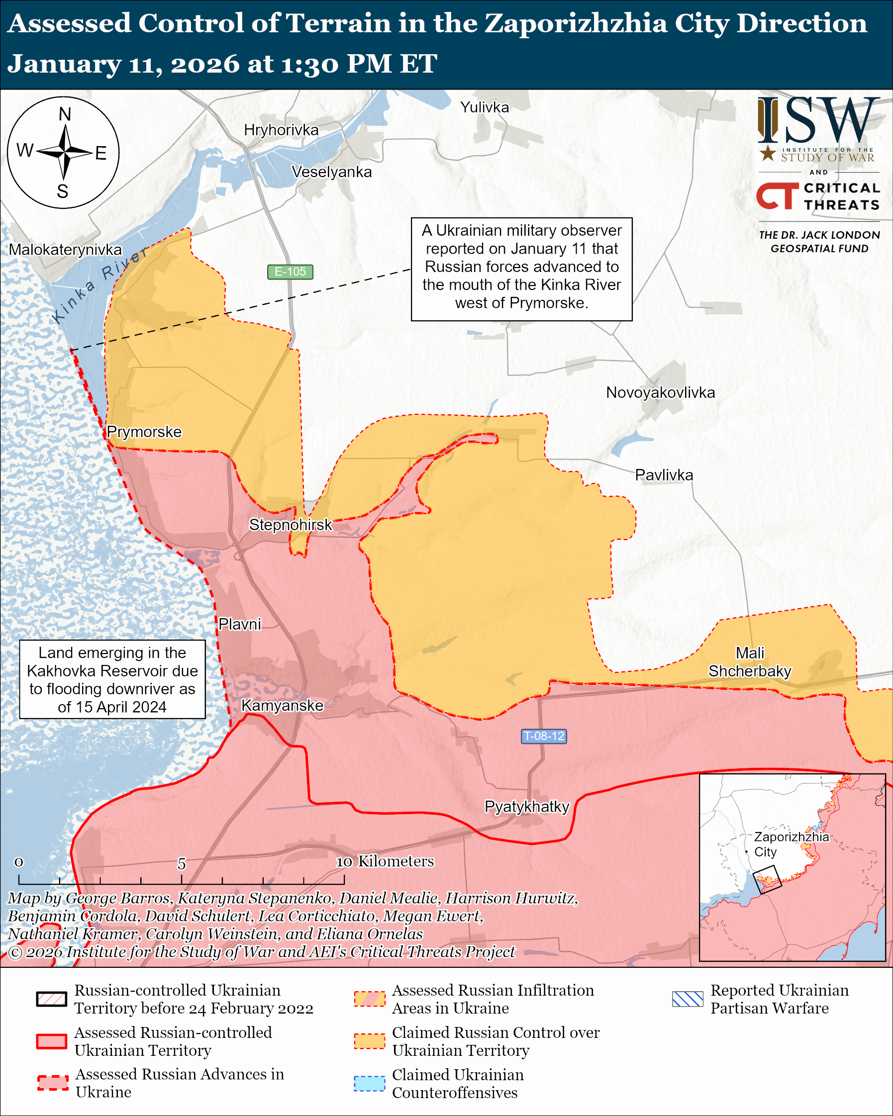 Assessed Russian advances: Mashovets reported on January 11 that Russian forces advanced to the mouth of the Kinka River west of Prymorske (northwest of Orikhiv).[62]
