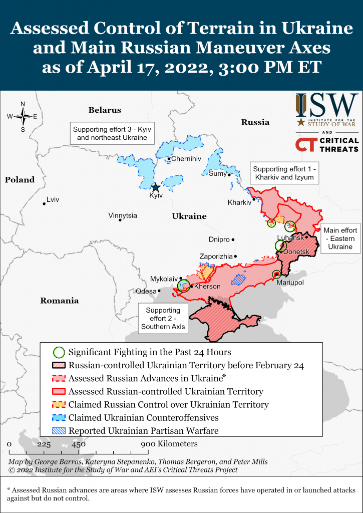 Russian forces continued to amass on the Izyum axis and in eastern Ukraine, increasingly including low-quality proxy conscripts, in parallel with continuous – and unsuccessful – small-scale attacks. Russian forces did not take any territory on the Izyum axis or in Donetsk and Luhansk Oblasts in the past 24 hours. Russian forces deploying to eastern Ukraine reportedly continue to face significant morale and supply issues and appear unlikely to intend, or be able to, conduct a major offensive surge in the coming days.[1] Deputy Ukrainian Minister of Defense Anna Malyar stated on April 17 that the Russian military is in no hurry to launch an offensive in eastern Ukraine, having learned from their experience from Kyiv – but Russian forces continue localized attacks and are likely unable to amass the cohesive combat power necessary for a major breakthrough.[2]