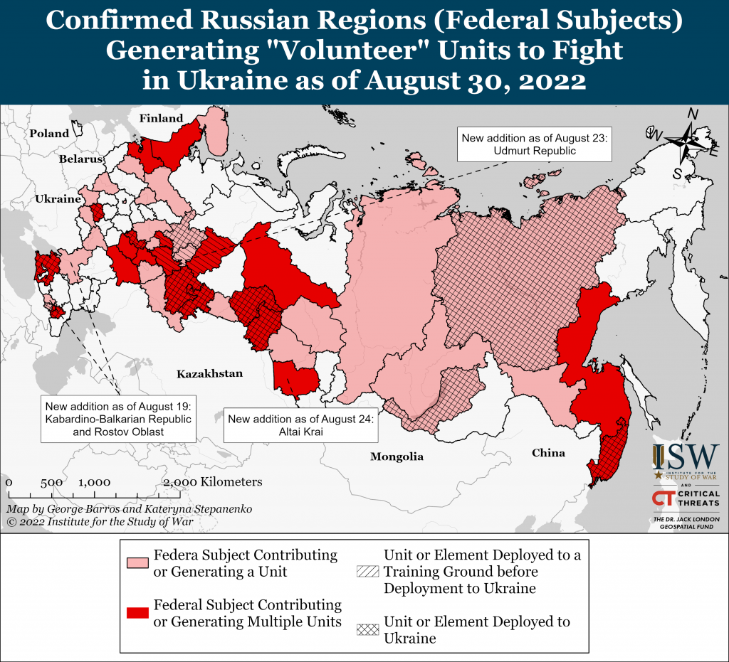 Russian federal subjects (regions) are continuing to recruit and deploy volunteer battalions. Oryol Oblast Governor Aleksandr Klychkov posted a recruitment reminder for the “Yermolov” volunteer battalion and the 3rd Army Corps and stated that the first batch of volunteers from Oryol Oblast have already been deployed to the frontline.[lxxii] Primorsky Krai Deputy Chairman Dmitry Mariza reported that the separate repair and restoration ”Arsenievsky” volunteer battalion deployed from Primorye to Donbas on August 29.[lxxiii] ISW previously reported on the formation of this battalion on August 22, and its deployment to Ukraine within one week of its formation supports ISW’s assessment that volunteer battalions are deploying to Ukraine severely understrength and poorly trained. [lxxiv]A local Primorsky Krai outlet also reported that Primorsky Krai is continuing recruitment efforts for volunteers for unspecified Pacific Fleet elements (likely naval infantry), the 83rd Separate Airborne Brigade, and unspecified elements of the Eastern Military District’s 5th Combined Arms Army.[lxxv]