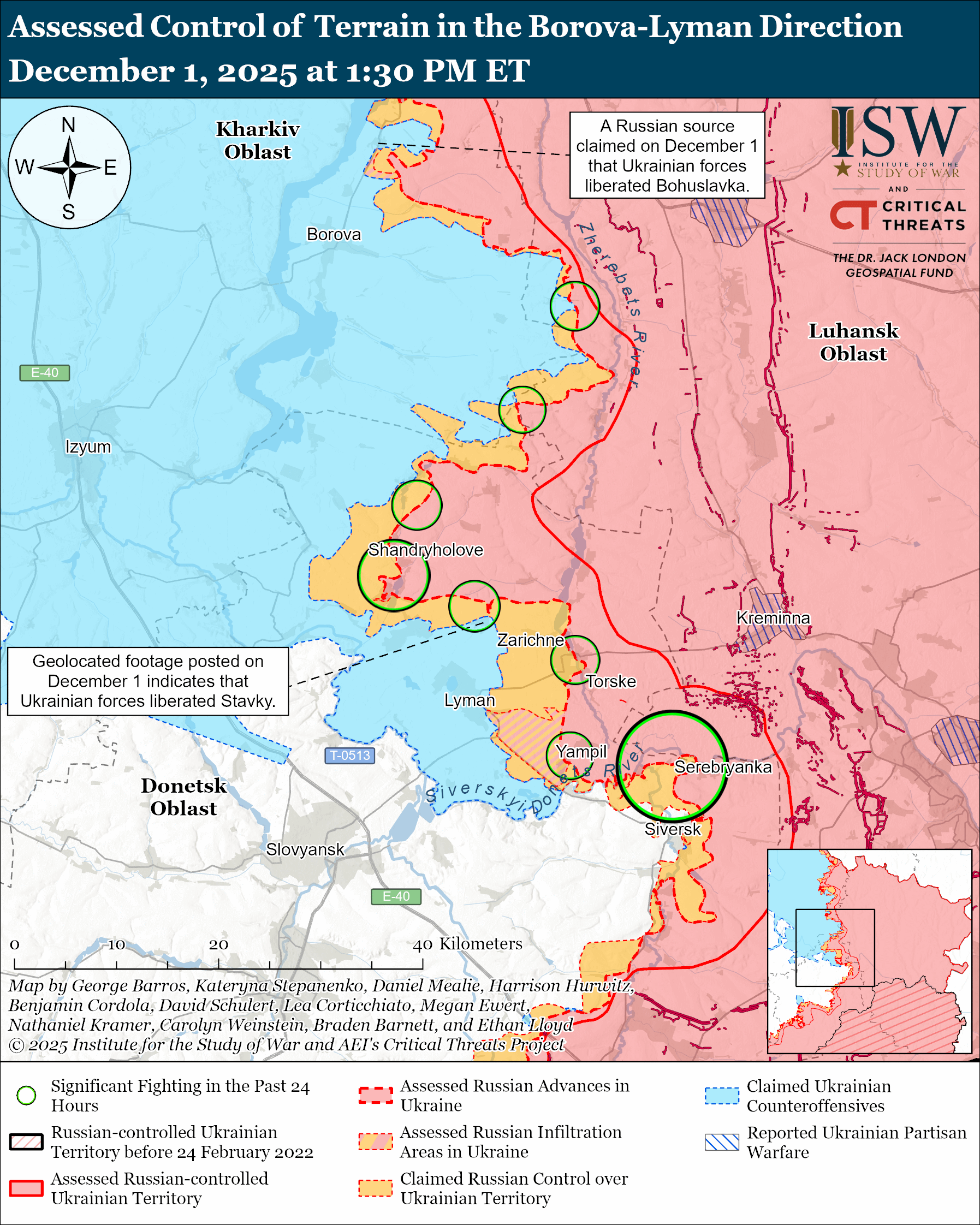 Refinement of areas under Russian claims: A Kremlin-affiliated Russian milblogger implied on November 30 that Ukrainian forces maintain positions in Bohuslavka (north of Borova), an area where Russian sources previously claimed that Russian forces maintained a presence.[52]