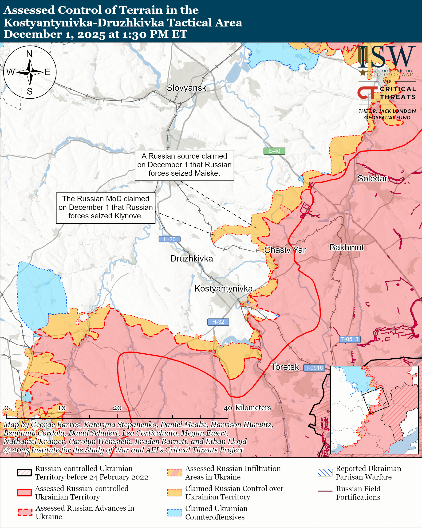 Prominent Russian milbloggers continue to undermine the Kremlin’s effort to portray a Russian victory in Ukraine as imminent or inevitable. A Kremlin-affiliated Russian milblogger responded to the Russian Ministry of Defense's (MoD) December 1 claim that Russian forces seized Klynove (north of Kostyantynivka, about 10 kilometers from the current Russian frontline) by criticizing the MoD's repeated exaggerations about battlefield successes.[13] The milblogger claimed that the Russian MoD is making premature claims that Russian forces seized settlements without offering any supporting evidence and is even claiming Russian success in settlements several kilometers away from confirmed Russian positions. The milblogger noted that the Russian MoD has made clearly false claims over five settlements in the Kostyantynivka-Druzhkivka tactical area in 2025 alone — Orikhovo-Vasylivka in February 2025, Novomarkove in March 2025, Markove and Mayske in September 2025, and Fedorivka in October 2025. The milblogger added that recent developments on the battlefield are strengthening the current Russian negotiating position and insinuated that the Russian MoD is actually hurting its negotiating position by making false claims that could easily "backfire" with the emergence of evidence to the contrary. The Kremlin has repeatedly made exaggerated claims about the battlefield as part of its ongoing cognitive warfare effort to falsely portray a Russian victory as inevitable, such that Ukraine and the West should concede to Russia’s demands now.[14] ISW continues to assess that while the situation in some specific sectors of the front line is serious, particularly in the Pokrovsk and Hulyaipole directions, the Kremlin’s efforts to present Russia’s victory in Ukraine as inevitable do not correspond to battlefield realities.[15] It is notable that the Kremlin’s misrepresentation of the situation on the ground continues to be so far from reality that prominent pro-war milbloggers continue to feel compelled to issue their own corrective statements.