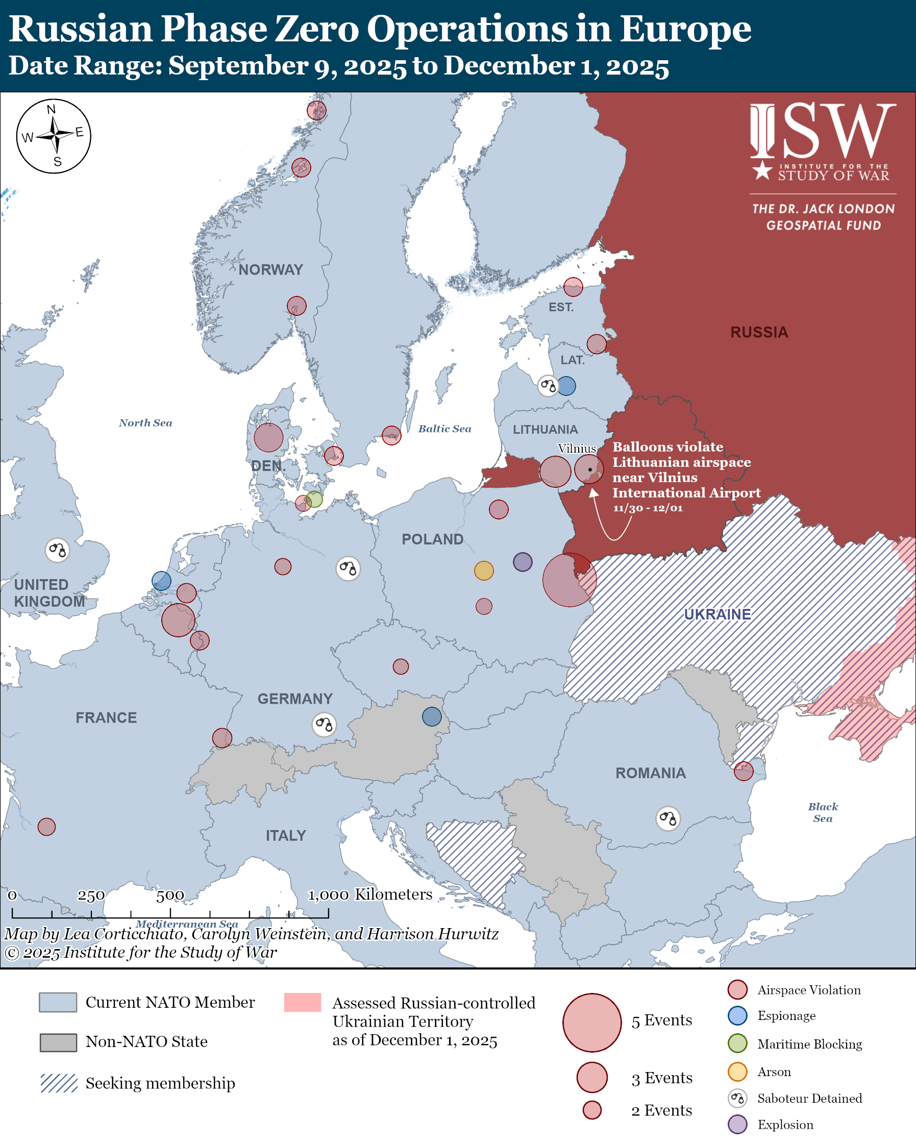 Balloon incursions in NATO airspace continue to shut down Lithuanian airports. Lithuanian authorities temporarily suspended operations at the Vilnius International Airport on the evening of November 30 into the early morning on December 1 due to balloons flying towards the airport.[28] Lithuanian air navigation company Oro Navigacija Director Saulius Batavicius stated that authorities detected roughly 60 balloons in Lithuanian airspace and that an unidentified actor launched the balloons continuously at varying altitudes and in small groups.[29] Lithuanian authorities have not attributed the balloon flights to any specific actor as of this writing, though Lithuanian officials previously attributed similar balloon incursions to Belarus.[30] The overnight balloon sightings come against the backdrop of repeated similar incursions from Belarusian airspace - the most recent of which occurred on the night of November 28 to 29 — that have closed the Vilnius Airport.[31] ISW continues to assess that Russia is increasingly engaging in covert and overt attacks against Europe and that ongoing Russian airspace violations are likely part of Russia’s ”Phase Zero” effort — Russia’s broader informational and psychological condition-setting effort that aims to prepare for a possible NATO-Russia war in the future.[32] ISW continues to assess that Belarus is Russia’s de facto cobelligerent in the war in Ukraine, such that suspected and confirmed incursions into NATO airspace from Belarusian airspace are very likely part of Russia’s broader Phase Zero effort.[33]