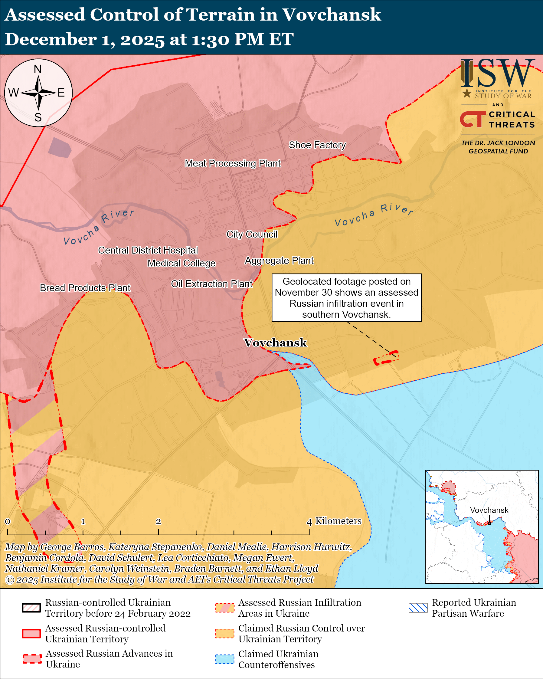Assessed Russian infiltrations: Geolocated footage published on November 30 shows Ukrainian forces striking a Russian servicemember in southern Vovchansk (northeast of Kharkiv City) in what ISW assesses was an infiltration event that did not change the control of terrain or the forward edge of the battle area (FEBA).[36] A Russian civilian who raises funds for Russian forces posted footage taken by a Russian drone on November 30 that shows Ukrainian forces striking the Russian servicemember, and acknowledged that Ukrainian forces killed the servicemember during a flag-raising mission.[37] ISW continues to assess that the Russian military command is using ostentatious flag raisings across the frontline to support its exaggerated claims of Russian advances as part of a cognitive warfare effort to portray Russian battlefield victory as inevitable.[38]