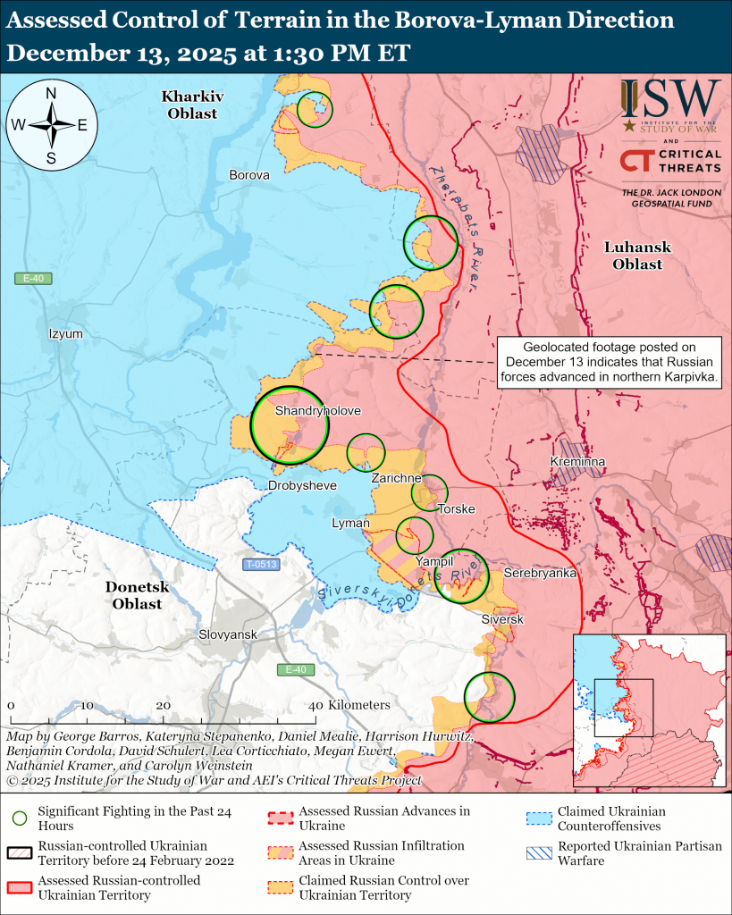 Ukrainian 11th Army Corps (AC) Spokesperson Colonel Dmytro Zaporozhets reported on December 12 that Russian forces are attempting to attack Lyman by bypassing Yampil (southeast of Lyman) from the north and south and warned that the situation in Yampil may worsen if Russian forces continue these operations.[52] Zaporozhets noted that poor weather conditions are the main factor inhibiting Ukrainian defensive operations near Yampil. Zaporozhets stated that Russian forces are primarily attacking in small groups from the Serebryanske forest area (southeast of Lyman) and will likely attempt to concentrate personnel in the area. Zaporozhets stated that water features — likely the Siverskyi Donets River — are preventing Russian forces near Yampil from supporting Russian offensive operations near Serebryanka and Dronivka (both east of Yampil across the Siverskyi Donets River in the Siversk direction). Zaporozhets stated that Lyman is a more important objective for Russian forces than Siversk in future operations against Slovyansk.