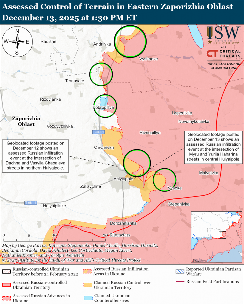 Assessed Russian infiltrations: Geolocated footage published on December 12 and 13 shows Ukrainian forces striking Russian-occupied buildings in northern and central Hulyaipole during what ISW assesses to have been Russian infiltration missions.[87] ISW assesses that these events did not change the control of terrain or the forward edge of the battle area (FEBA) at this time.