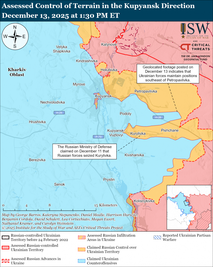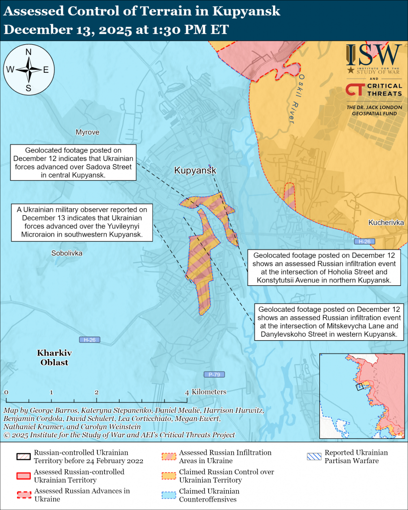 Ukrainian forces continue to advance within and near Kupyansk, and more details have emerged about the counteroffensive effort. Geolocated footage published on December 12 indicates that Ukrainian forces made further advances in central Kupyansk while conducting clearing operations and also advanced southeast of Petropavlivka (east of Kupyansk).[1] Ukrainian military observer Yuriy Butusov reported that Ukrainian forces completely seized Yuvileynyi Microraion in southwestern Kupyansk and assessed that this lost ground will likely prevent Russian forces from sustaining any remaining positions in southern Kupyansk.[2] Butusov reported that Ukrainian forces are still clearing Kupyansk, and geolocated footage published on December 12 and 13 indicates that Russian infiltration groups remain in northern and western Kupyansk.[3] The chief of staff of a Ukrainian drone battalion reported that Russian forces are still attempting to penetrate into Kupyansk, primarily on foot.[4] Russian milbloggers acknowledged Ukrainian advances into Yuvileynyi Microraion and northwest of Kupyansk and stated that heavy fighting continues near Myrove and Radkivka (both northwest to north of Kupyansk).[5] One milblogger acknowledged Russia's loss of Radkivka and two defensive positions south and east of Radkivka.[6] Many Russian milbloggers continued to cast doubt on or outright reject many of the Ukrainian reports of advances despite available evidence supporting the Ukrainian reporting.[7]