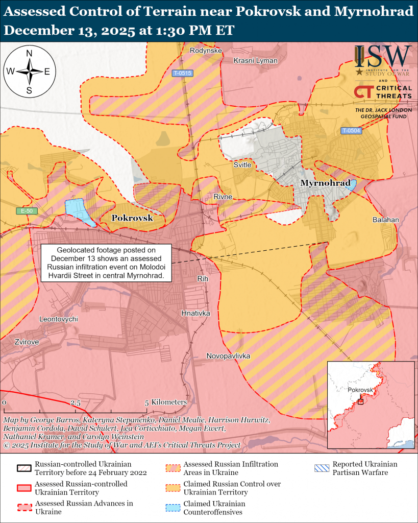 Assessed Russian infiltrations: Geolocated footage published on December 13 shows Russian forces operating in central Myrnohrad (east of Pokrovsk) during what ISW assesses to have been a Russian infiltration mission.[72] ISW assesses that this event did not change the control of terrain or the forward edge of the battle area (FEBA) at the time.