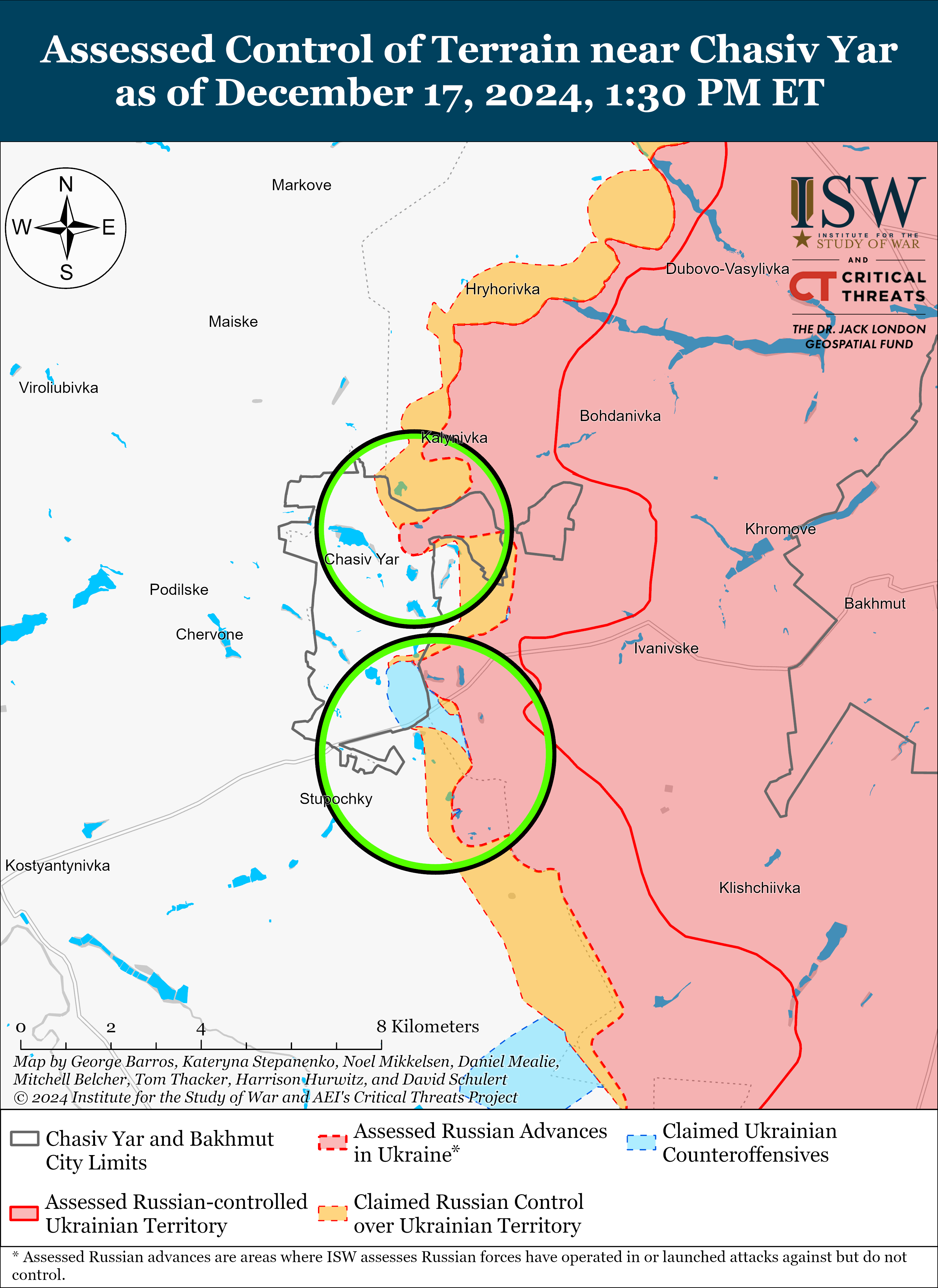 Russian forces continued offensive operations in the Chasiv Yar direction on December 16 and 17 but did not make any confirmed advances. Russian sources claimed that Russian forces leveraged bad weather on December 16 to advance into the Refractory Plant in central Chasiv Yar and that fighting for the plant continued on December 17.[44] Ukrainian Luhansk Group of Forces Spokesperson Major Anastasiya Bobovnikova reported on December 17 that Ukrainian forces are striking Russian forces before they can reach the Refractory Plant, however.[45] A Russian miblogger claimed that Russian forces are conducting clearing operations in unspecified windbreaks near Stupochky (south of Chasiv Yar). Russian forces continued attacking near Chasiv Yar itself, northeast of Chasiv Yar near Orikhovo-Vasylivka, and south of Chasiv Yar near Stupochky on December 16 and 17.[46] Bobovnikova further noted on December 17 that Russian forces are attempting to cross the Siverskyi Donets Donbas Canal and hide within the canal to consolidate personnel for assaults, but that Ukrainian forces repel Russian forces.[47] A Ukrainian soldier operating in the Chasiv Yar area noted on December 17 that Russian forces are conducting infantry assaults with drone support along the Siverskyi Donets Donbas Canal as they are unable to cross the canal with armored vehicles.[48] Russian drone operators of the Sever-V Brigade (Russian Volunteer Corps) and elements of the Ivanovo VDV Airborne (VDV) Formation (98th VDV Division) are operating near Chasiv Yar.[49]