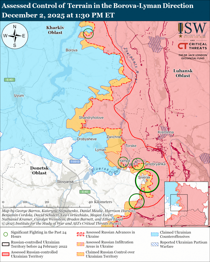 The commander of the Ukrainian drone regiment operating in the Kupyansk direction reported on December 2 that the Ukrainian forces pushed Russian forces from the northern outskirts of Kupyansk to the Oskil River and cleared the northwestern outskirts of Kupyansk.[71] The commander stated that Ukrainian forces maintain ground line of communication (GLOCs) to the east (left) bank Oskil River despite Russian glide bomb, fiberoptic drone, and missile strikes, but noted that logistics are complicated in the area.