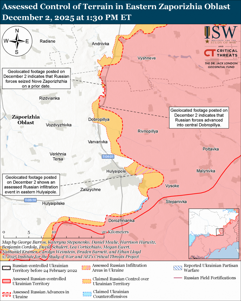 Russian forces attacked near Novopavlivka itself, south of Novopavlivka near Dachne and Filiya, and southwest of Novopavlivka near Yalta and Zelenyi Hai on December 1 and 2.[111]