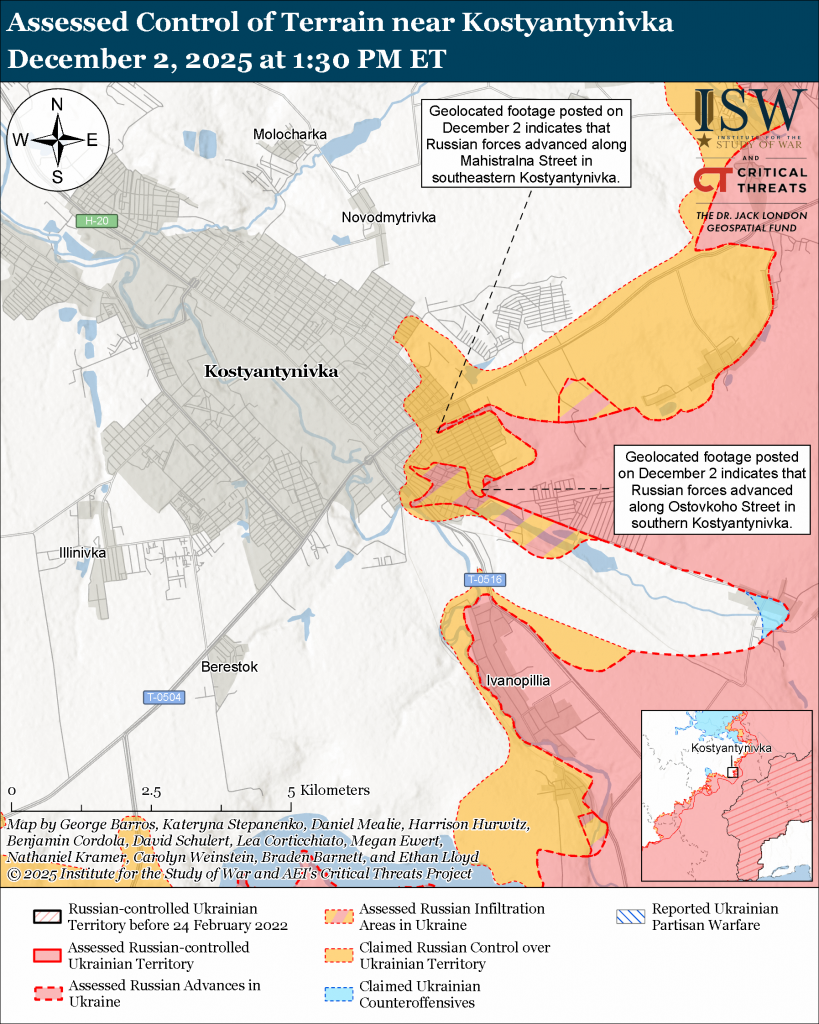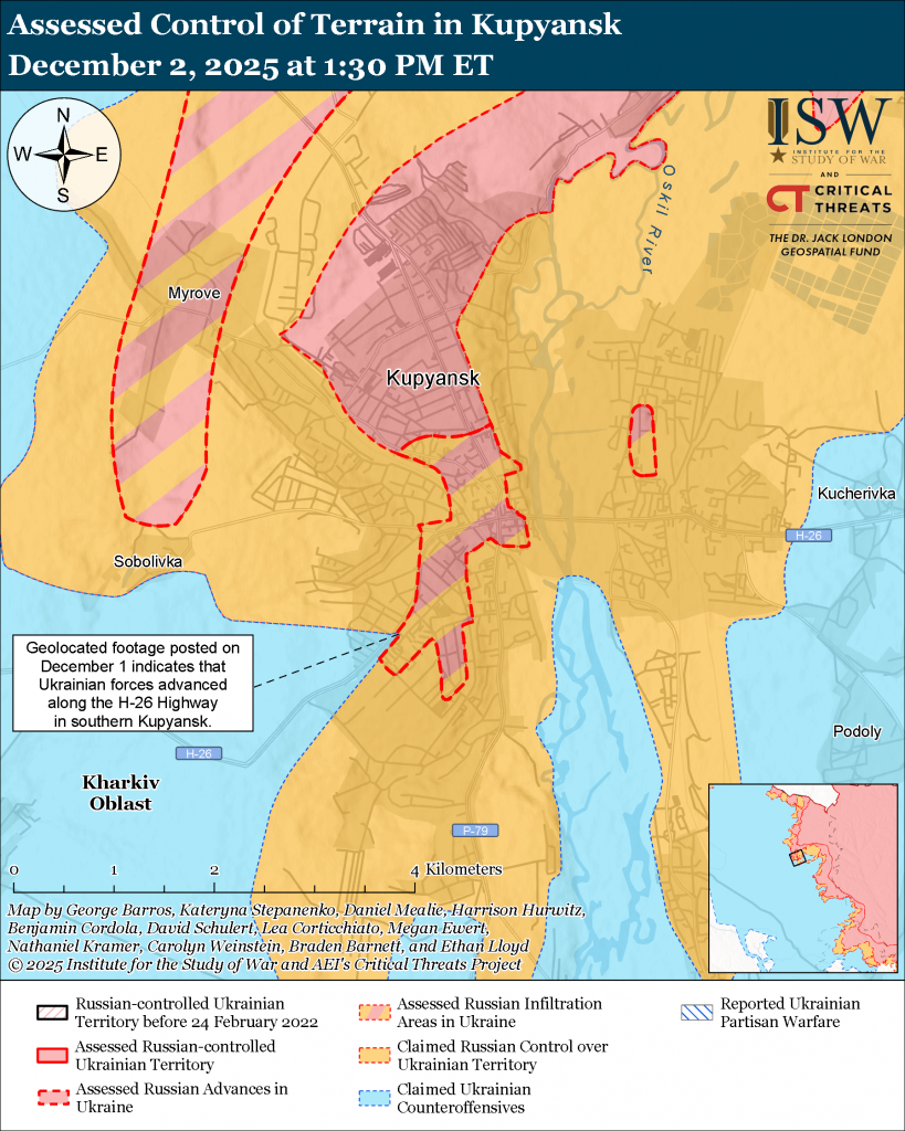 The Kremlin intensified its cognitive warfare effort that aims to portray a Russian victory in Ukraine as imminent in the lead up to the December 2 US-Russia meeting, likely to coerce the West into accepting Russia's absolutist demands. Putin held a meeting with Russian military commanders on the evening of November 30 and answered journalists' questions on December 2, during which Putin flaunted Russia's alleged successes across the battlefield.[6] The Kremlin notably did not publish the readout of Putin's meeting with the commanders until late in the evening on December 1, suggesting that the Kremlin was trying to create informational efforts ahead of Putin's December 2 meeting with the US delegation. Putin and Russian military commanders claimed that Russian forces seized Pokrovsk, southern Myrnohrad (east of Pokrovsk), Vovchansk, and Kupyansk. Ukrainian officials and Russian milbloggers continued to refute these Kremlin claims, however. Ukrainian Commander-in-Chief General Oleksandr Syrskyi reported on December 2 that Ukrainian forces are clearing Russian forces from Kupyansk and blocking Russian sabotage and reconnaissance groups' infiltration routes into the town.[7] Ukraine's Joint Forces Task Force reported that Ukrainian forces control most of Kupyansk and that Russian groups only maintain a presence in the northern part.[8] Ukrainian military officials reported that Ukrainian forces maintain positions within Vovchansk and Pokrovsk, and a Russian milblogger acknowledged that Ukrainian forces remain in northern Pokrovsk.[9]