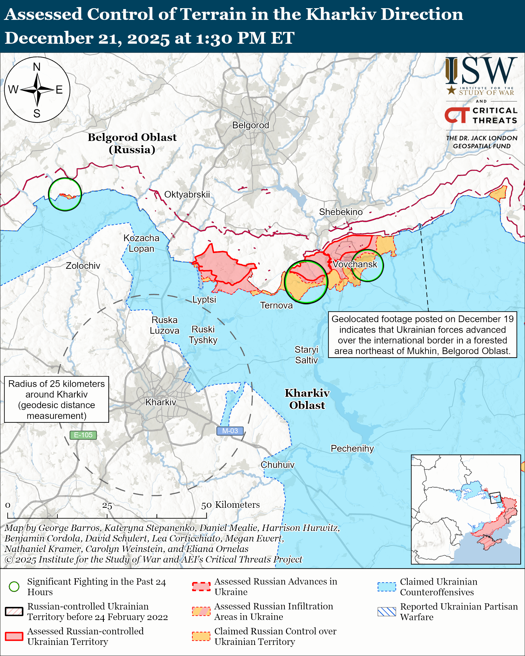 Russian forces are conducting a new cognitive warfare campaign through limited cross-border attacks across a broad part of the previously dormant northern frontline in Sumy and Kharkiv oblasts. Ukrainian authorities reported on December 20 and 21 that Russian forces entered Hrabovske, Sumy Oblast (a small rural village southeast of Sumy City along the international border) overnight on December 19 to 20, and the Russian Ministry of Defense (MoD) and other Russian sources claimed on December 20 and 21 that elements of the Russian had seized Hrabovske and Vysoke (immediately south of Hrabovske).[i] Ukrainian Armed Forces Main Communications Directorate Spokesperson Captain Dmytro Lykhovyi stated on December 21 that Ukrainian forces withdrew from several positions near Hrabovske and are working to stabilize the area.[ii] Available evidence indicates that Russian forces have likely seized Hrabovske. A source reportedly affiliated with Ukrainian military intelligence reported that Hrabovske is a contested "gray zone" that neither Russian nor Ukrainian forces currently control, however.[iii] Russian milbloggers reported that Russian forces advanced across the international border into Hrabovske under the cover of night and fog and also entered Ryasne (immediately west of Hrabovske).[iv] The Ukrainian Joint Forces Task Force acknowledged on December 21 that fighting continues for Hrabovske but rejected reports that Russian forces had entered Ryasne.[v] Russian sources credited elements of the 34th Motorized Rifle Brigade (49th Combined Arms Army [CAA], Southern Military District [SMD]) with the seizure of Hrabovske.[vi]
