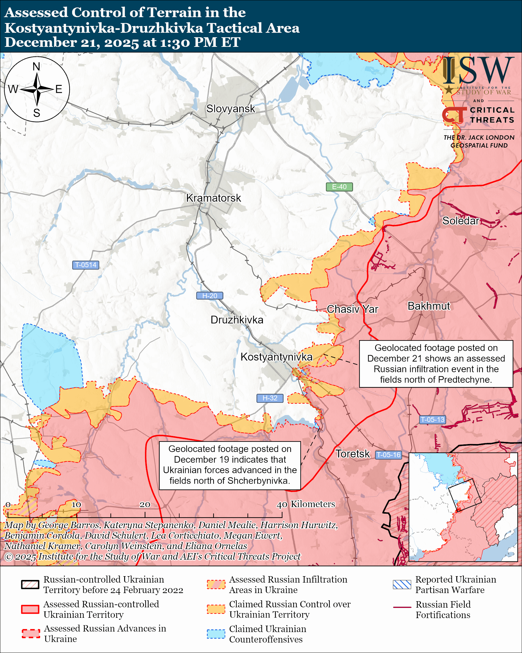 Assessed Russian infiltrations: Geolocated footage published on December 21 shows Russian forces operating northwest of Predtechyne (east of Kostyantynivka) in what ISW assesses as a Russian infiltration mission that did not change control of terrain or the forward edge of the battle area (FEBA) at this time.[lxxii]