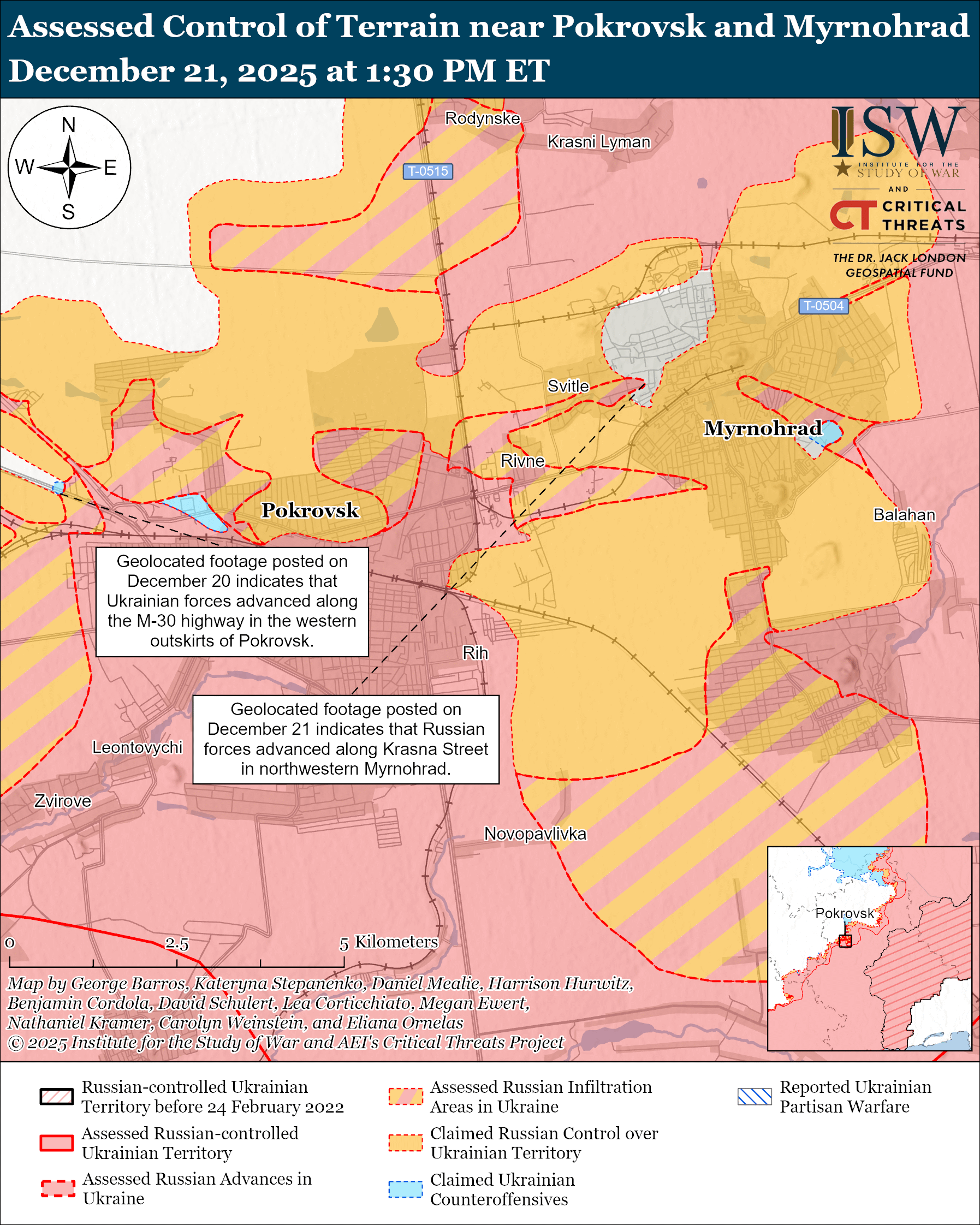 Assessed Russian infiltrations: Geolocated footage published on December 21 shows Russian forces operating in northwestern Myrnohrad (east of Pokrovsk) during what ISW assesses was a Russian infiltration mission that did not change the control of terrain or FEBA at this time.[lxxx]