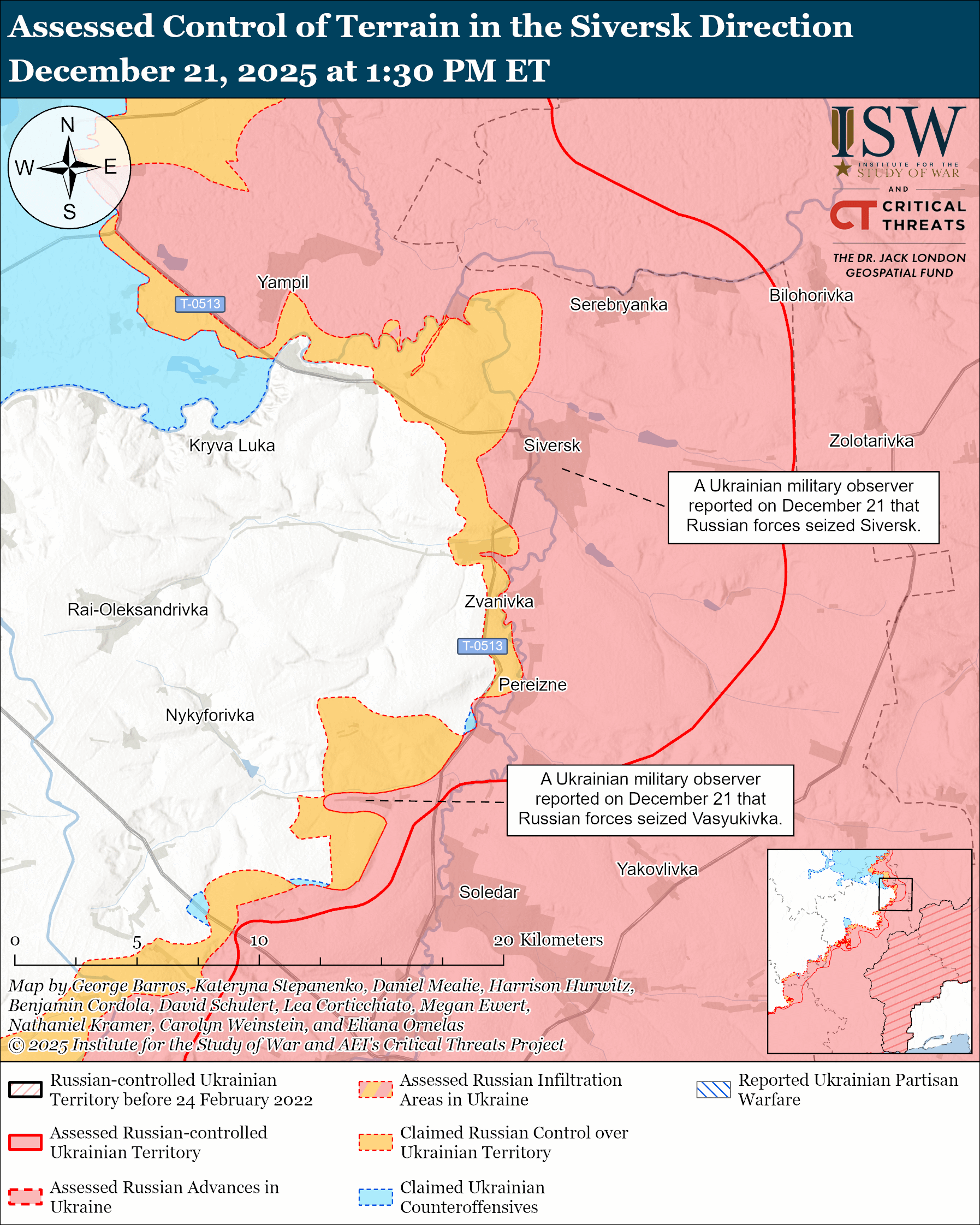 Russian forces have likely seized Siversk — a town with a pre-war population of less than 11,000 — after 41 months of fighting. Ukrainian military observer Kostyantyn Mashovets reported on December 21 that Russian forces completed the seizure of Siversk, advanced to heights west and northwest of Siversk, and reached the chalk quarry west of Siversk.[xxxi] Mashovets reported that Russian forces also made tactical gains north of Svyato-Pokrovske and seized Fedorivka and Vasyukivka (all southwest of Siversk) since mid-November 2025.[xxxii] The Kremlin claimed that Russian forces seized Siversk as of December 11, and Russian President Vladimir Putin and senior Russian defense officials have since been using the seizure of the town to promote the false narrative that Ukrainian lines are collapsing and that Russian forces are capable of immediately threatening Slovyansk.[xxxiii] The Russian efforts in the Siversk direction have been extremely lengthy, especially given that Siversk has an area of about 10 square kilometers with a pre-war population of about 11,000. Russian forces took 41 months to advance roughly 12 kilometers from Lysychansk (east of Siversk) to the western administrative boundary of Siversk.[xxxiv] Ukrainian resistance significantly delayed Russian efforts on the approaches to Siversk: ISW assesses that Russian forces seized Verkhnokamyanske (about four kilometers east of Siversk) as of October 9, 2024, Bilohorivka (about 10 kilometers northeast of Siversk) as of February 23, 2025, and Serebryanka (about four kilometers northeast of Siversk) as of August 16, 2025.[xxxv] ISW first observed evidence that Russian forces entered Siversk’s town limits no later than November 18, indicating that Russian forces likely took 33 days to completely seize the town (with an area of three Central Parks) once entering it.[xxxvi] Russian forces must still advance the 30 kilometers from Siversk to Slovyansk and complete the seizure of Lyman before they can begin a direct assault on Slovyansk itself.[xxxvii] The Kremlin has been exaggerating the immediate implications of the seizure of Siversk in attempts to falsely portray Russian forces as imminently threatening the northern part of the Fortress Belt and making significant simultaneous advances across the theater, such that the frontline is imminently collapsing. Russian gains continue to be slow and grinding as they have been for the past two years.