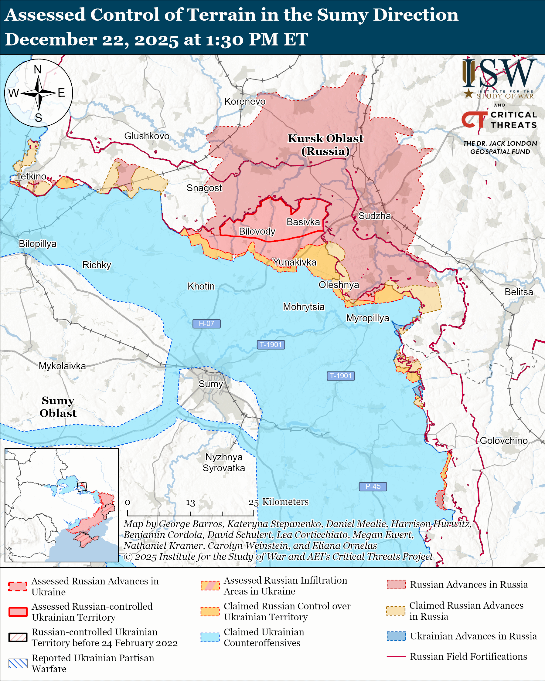 [13] https://understandingwar.org/research/russia-ukraine/russian-offensive-campaign-assessment-november-20-2025/; https://understandingwar.org/research/russia-ukraine/russian-offensive-campaign-assessment-december-9-2025/; https://understandingwar.org/research/russia-ukraine/russian-offensive-campaign-assessment-december-10-2025/; https://understandingwar.org/research/russia-ukraine/russian-offensive-campaign-assessment-november-28-2025/