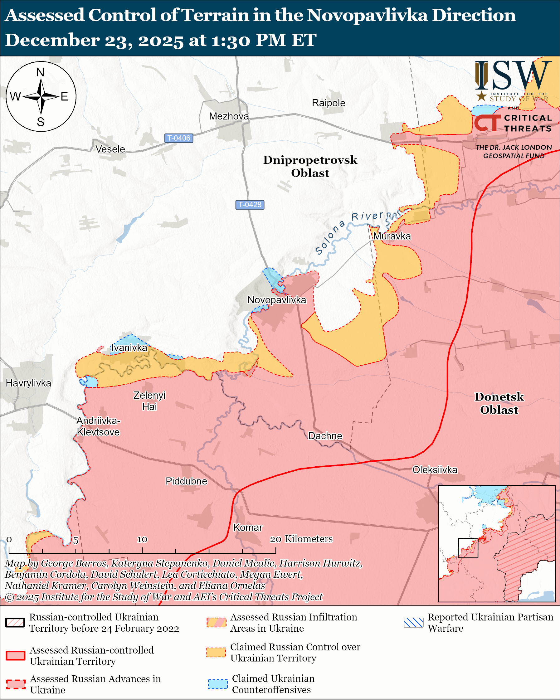 Russian forces attacked near Novopavlivka itself; southeast of Novopavlivka near Horikhove; and south of Novopavlivka near Filiya and Dachne on December 22 and 23.[civ]
