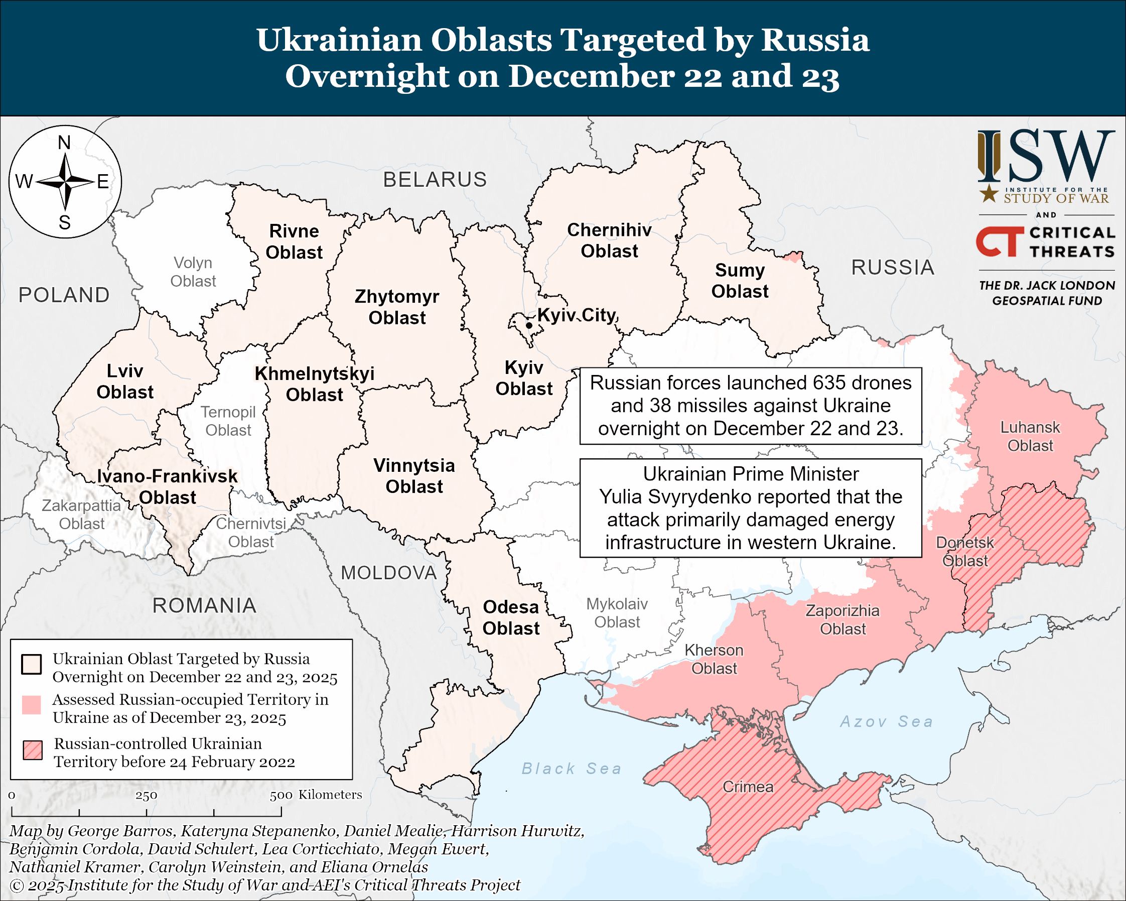 Russia conducted another large-scale combined missile and drone strike against Ukraine overnight on December 22 and 23, primarily targeting energy infrastructure in western Ukraine. The Ukrainian Air Force reported that Russian forces launched a combined missile and drone strike against Ukrainian critical infrastructure using 635 Shahed-type, Gerbera-type, and other strike drones (of which around 400 were Shaheds); three Kinzhal Kh-47M2 ballistic missiles; and 35 Kh-101 and Iskander-K cruise missiles.[i] The Ukrainian Air Force reported that Ukrainian forces repelled 587 drones and 34 Kh-101 and Iskander-K cruise missiles as of 1130 local time; that the three Kinzhal missiles did not reach their targets; and that 39 strike drones struck 21 locations while drone debris fell in eight locations.[ii] Ukrainian Air Force Spokesperson Yuriy Ihnat credited Ukrainian F-16 fighter aircraft with shooting down most of the Russian cruise missiles.[iii] Ukrainian Prime Minister Yulia Svyrydenko reported that the attack primarily damaged energy infrastructure in western Ukraine.[iv] Ukrainian regional officials reported that Russian forces struck critical and energy infrastructure in Novohrod-Siverskyi, Chernihiv Oblast; Shostka, Sumy Oblast; and Ivano-Frankivsk, Khmelnytskyi, Rivne, and Lviv oblasts.[v] Ukrainian Acting Energy Minister Artem Nekrasov stated that Russian strikes caused nearly full power outages in Rivne, Ternopil, and Khmelnytskyi oblasts and milder power outages in Vinnytsia, Chernihiv, Zhytomyr, Donetsk, Dnipropetrovsk, and Kharkiv oblasts.[vi] The Ukrainian state energy operator Ukrenergo stated that the December 22 to 23 strike is the ninth large-scale Russian combined strike against Ukrainian energy infrastructure since the start of 2025, and Ukraine’s largest private energy company, DTEK, reported that the strike marked the seventh large-scale attack on DTEK's thermal power plants (TPPs) since October 2025.[vii]