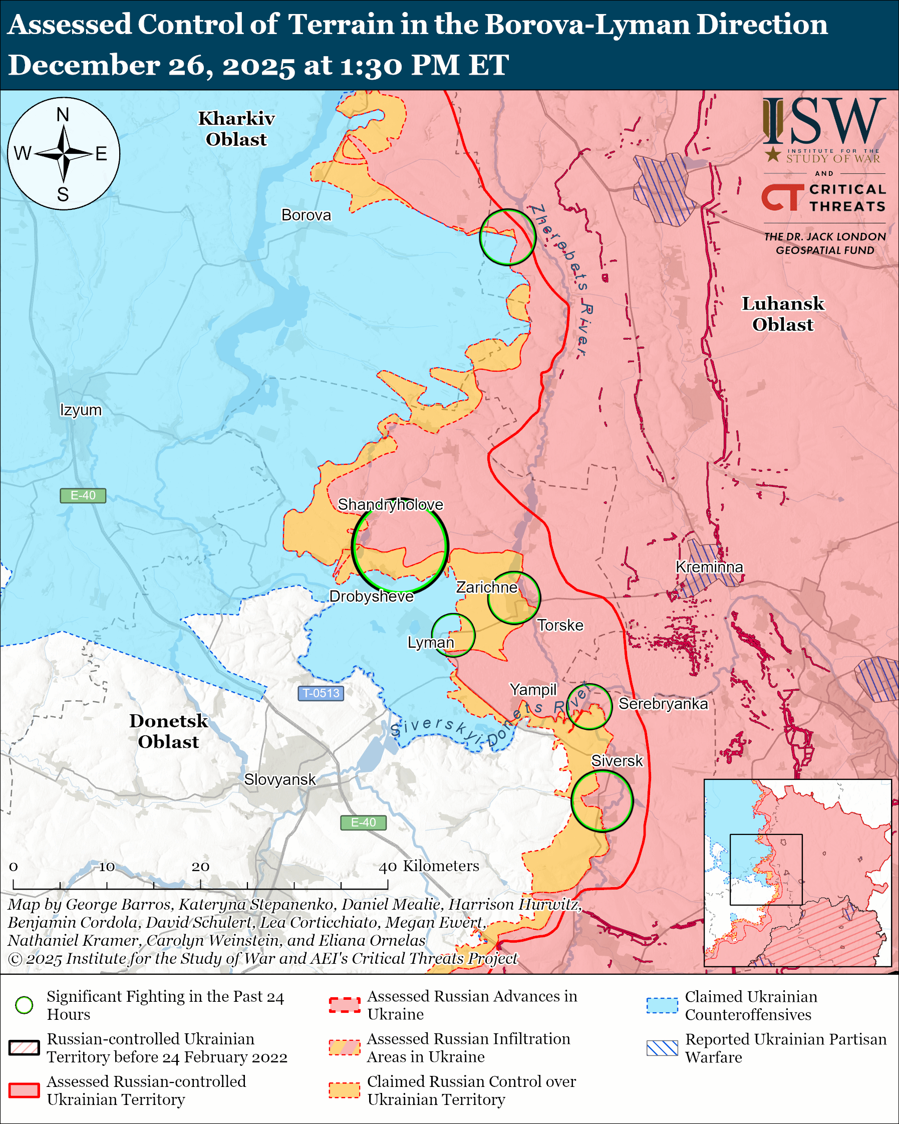 Russian forces continued offensive operations in the Slovyansk-Lyman direction on December 25 and 26 but did not make confirmed advances.