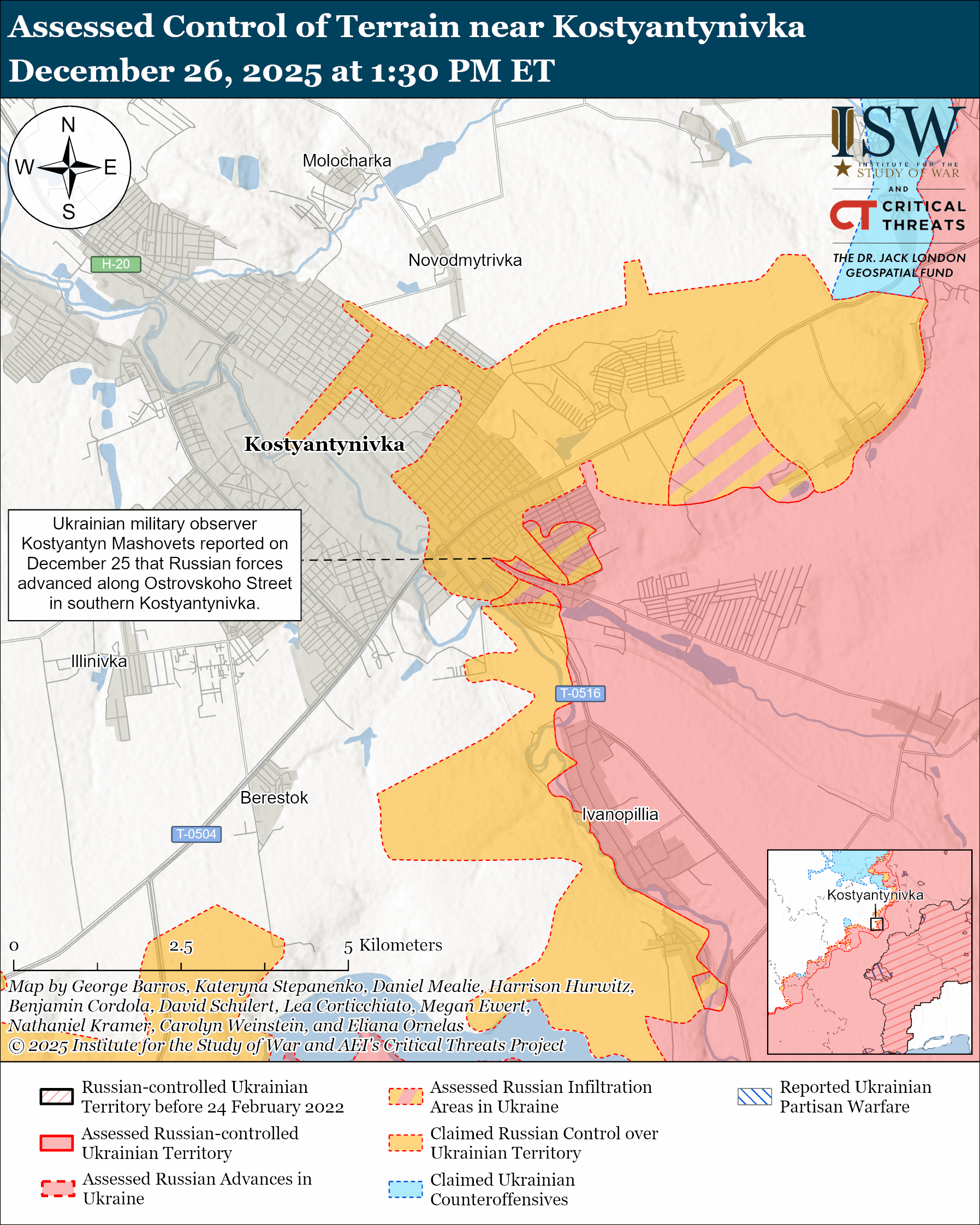 Assessed Russian advances: Ukrainian military observer Kostyantyn Mashovets reported on December 25 that Russian forces advanced in southern Kostyantynivka.[126] Geolocated footage published on December 24 indicates that Russian forces recently advanced along the T-0516 Toretsk-Kostyantynivka highway south of Kostyantynivka.[127]