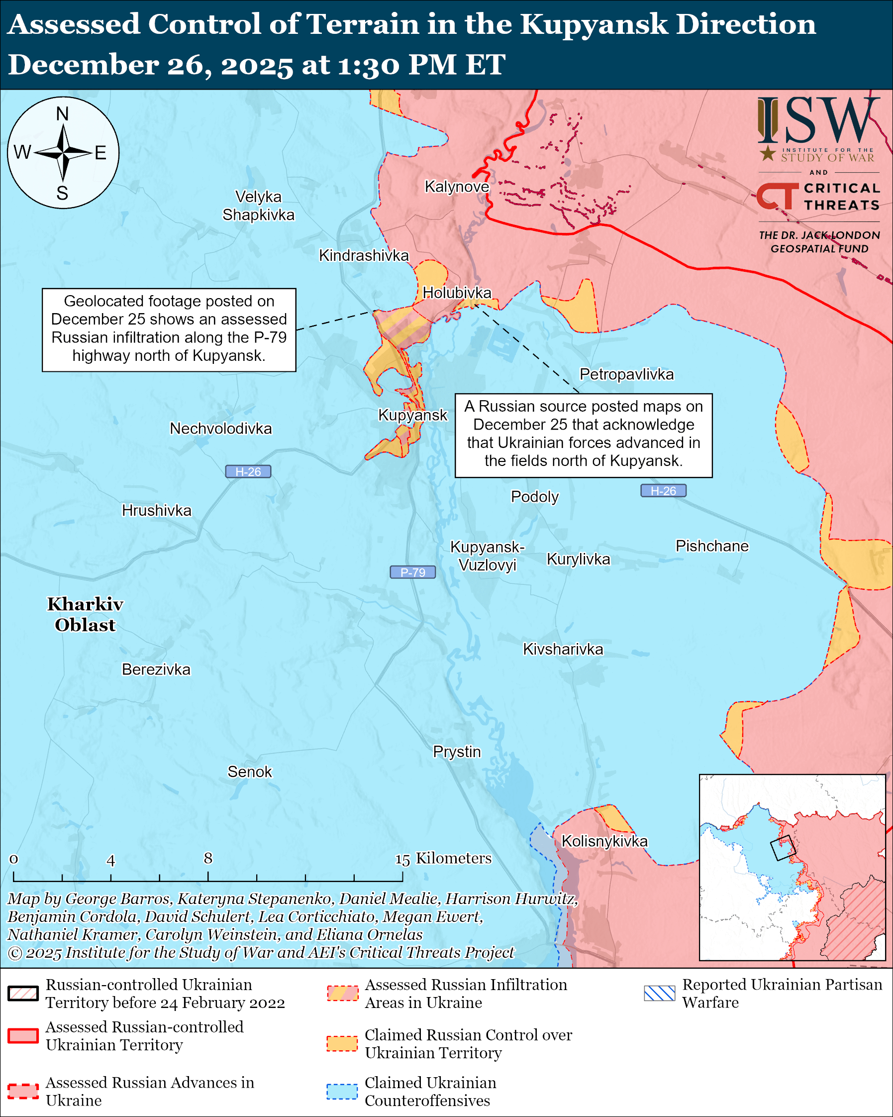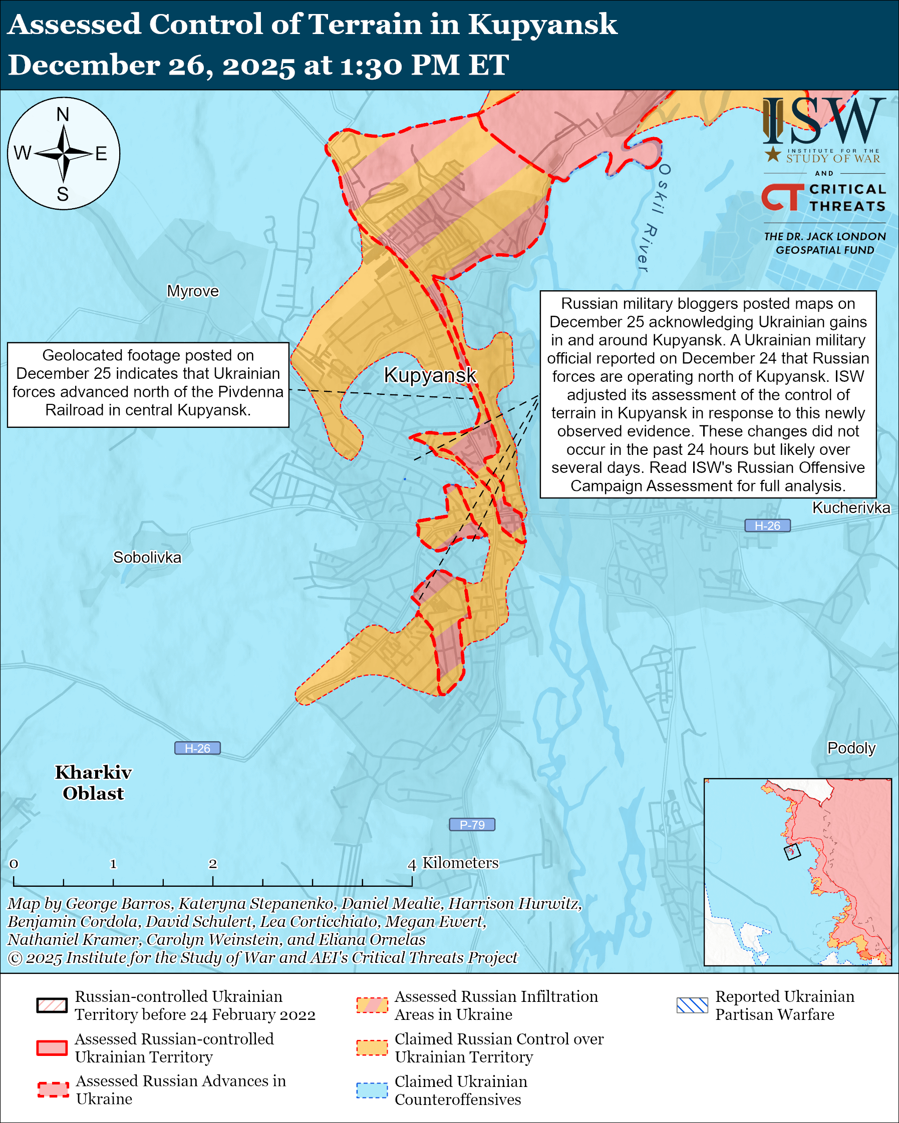 Assessed Russian infiltrations: Geolocated footage published on December 24 shows Russian forces operating along the P-79 Kupyansk-Chuhuiv highway north of and in northern Kupyansk to the south of Radkivka (north of Kupyansk) in what ISW assesses was a Russian infiltration mission that did not change control of terrain or the forward edge of battle (FEBA).[96] Ukrainian Joint Forces Task Force Spokesperson Colonel Viktor Trehubov reported on December 24 that Russian infiltrators are operating in northern Kupyansk and areas north of Kupyansk, indicating that Russian forces are conducting infiltration operations in northeastern Kupyansk.[97] ISW does not assess that this change in control of terrain occurred in the previous 24 hours.