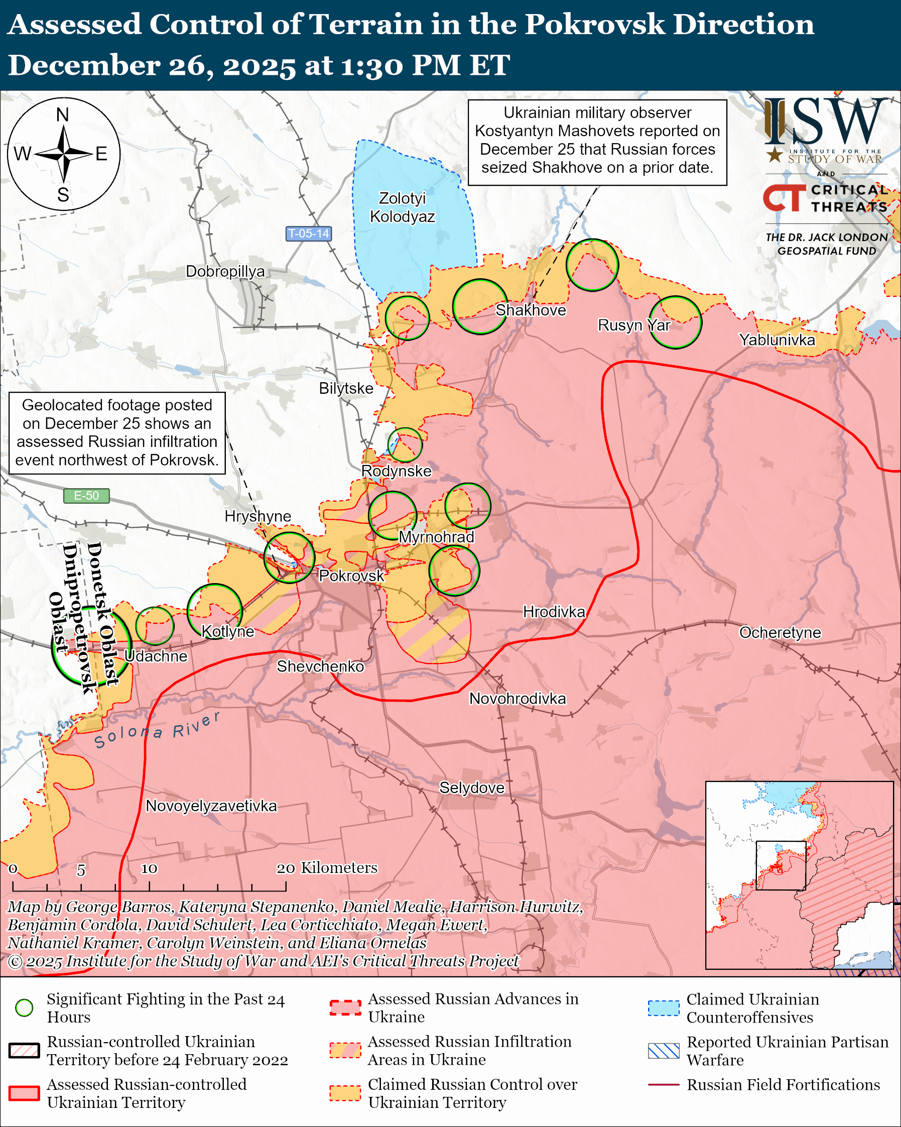 Assessed Russian advances: Mashovets reported on December 25 that Russian forces seized Shakhove (east of Dobropillya) on a prior date.[142]