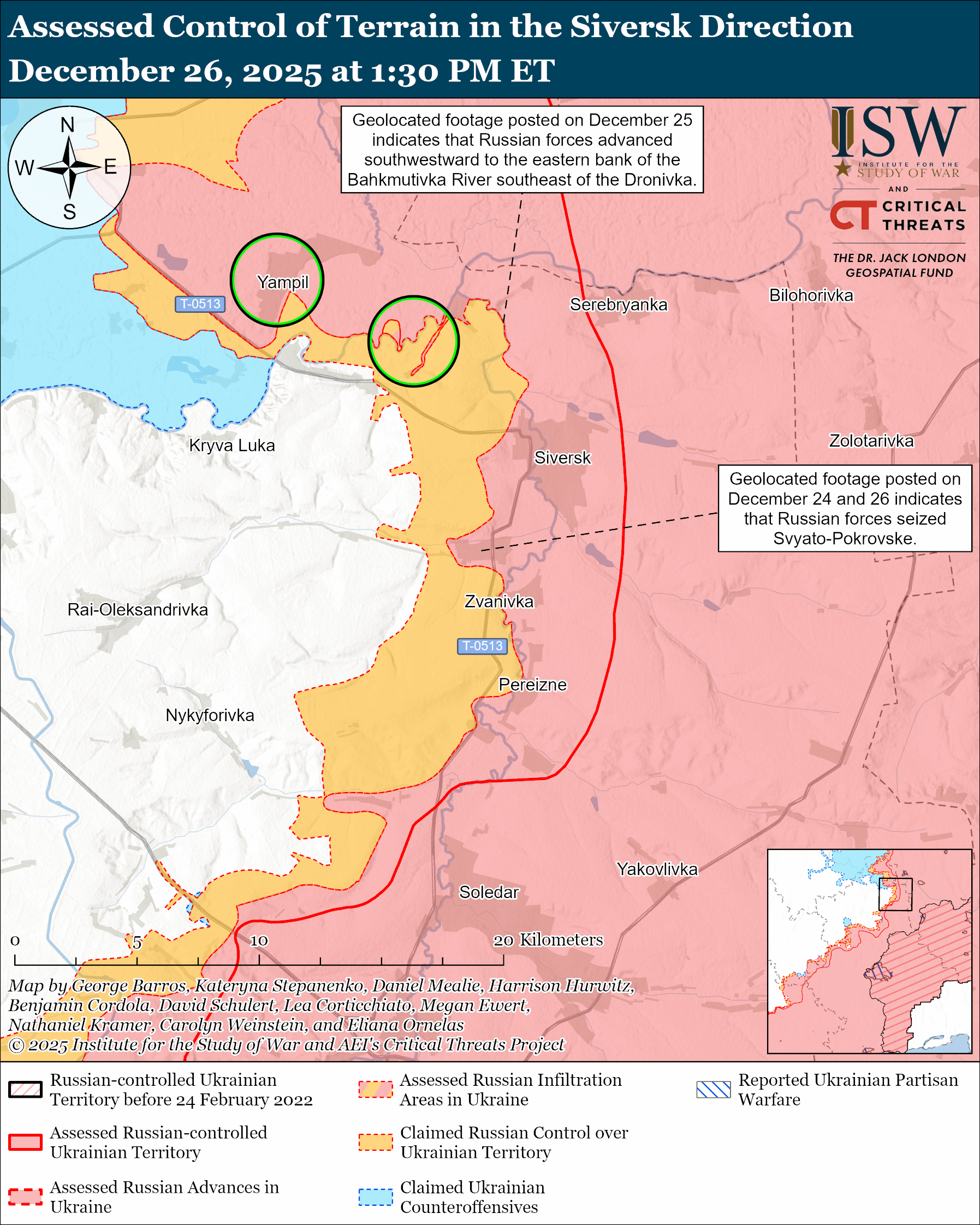 Assessed Russian advances: Geolocated footage published on December 26 indicates that Russian forces recently seized and advanced north of Svyato-Pokrovske (southwest of Siversk).[116] Geolocated footage published on December 21 and 25 indicates that Russian forces recently advanced southeast of Dronivka (northwest of Siversk) and in northern Svyato-Pokrovske (southwest of Siversk).[117] Russian sources, including the Russian Ministry of Defense (MoD), claimed on December 25 that Russian forces seized Svyato-Pokrovske (southwest of Siversk).[118]