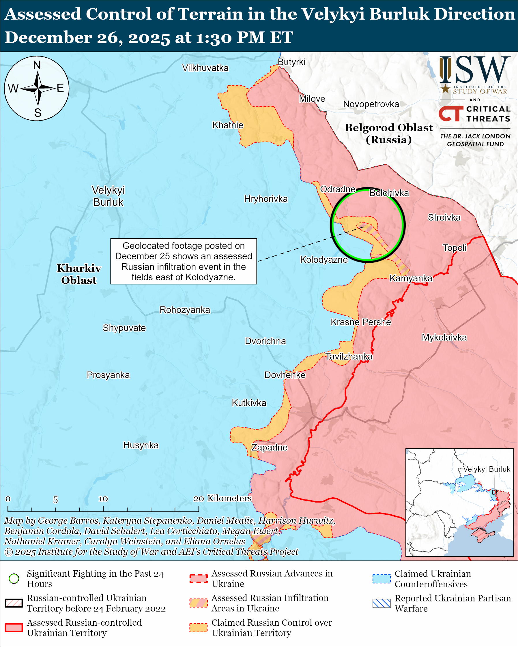 Assessed Russian infiltration: Geolocated footage published on December 25 shows Russian forces operating south of Dvorichanske (southeast of Velykyi Burluk) after what ISW assesses was a Russian infiltration mission that did not change the control of terrain or the forward edge of the battle area (FEBA).[93]