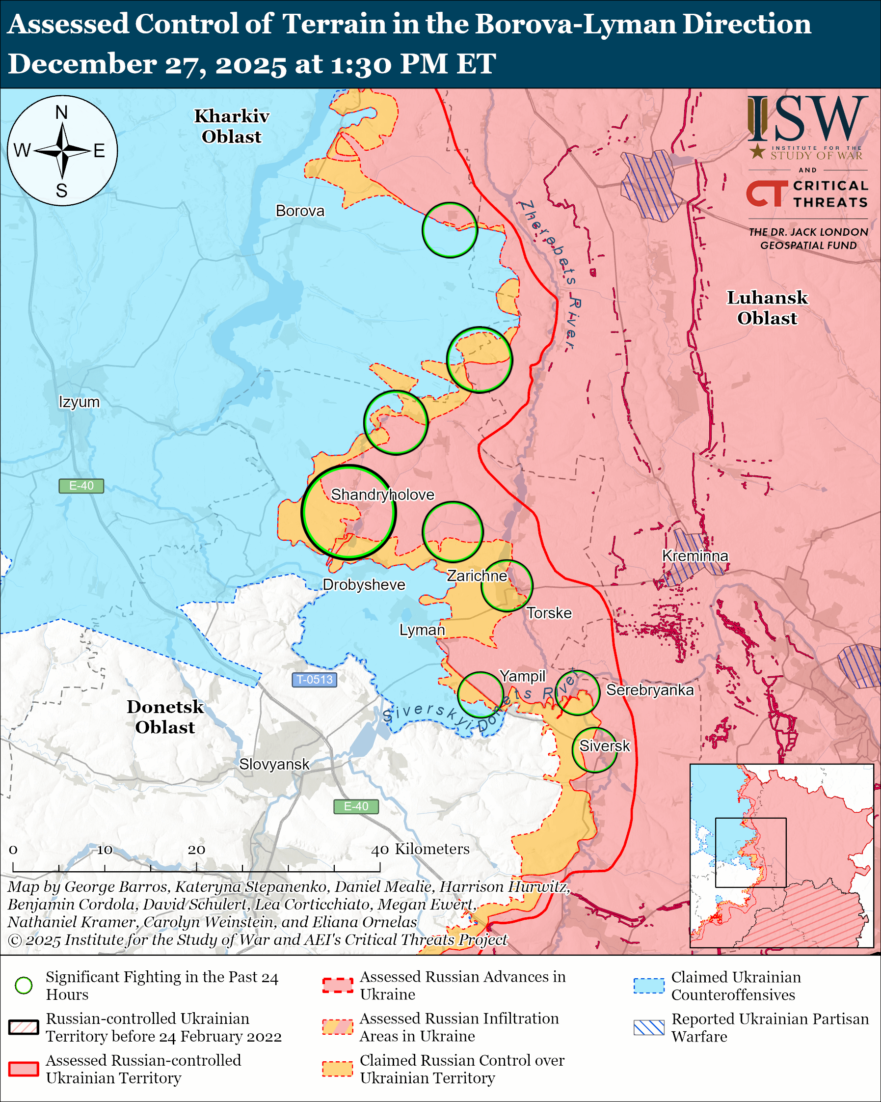 A Ukrainian brigade operating in the Siversk direction reported on December 27 that Russian forces are using small group infiltration tactics to enter Dronivka and secure positions along key ground lines of communication (GLOCs) from Siversk and Yampil.[55] A Russian milblogger claimed that Russian drone operators continue to deny Ukrainian forces the ability to safely move along GLOCs between Slovyansk to Rai-Oleksandrivka (southwest of Siversk).[56]