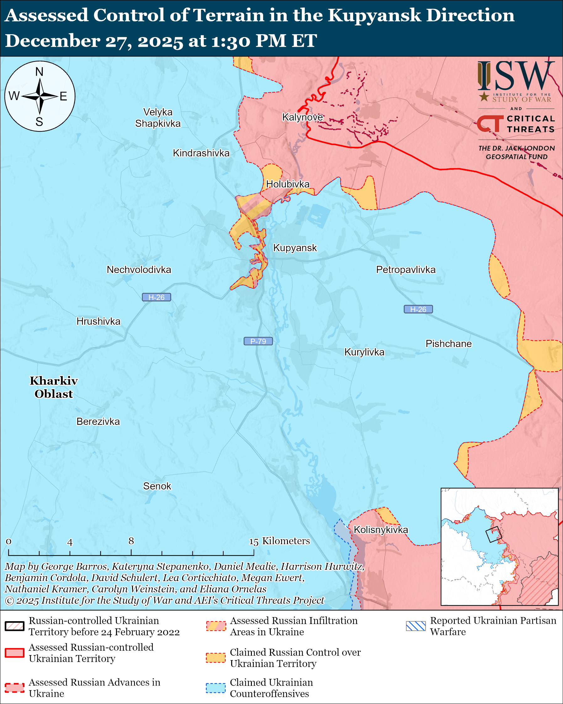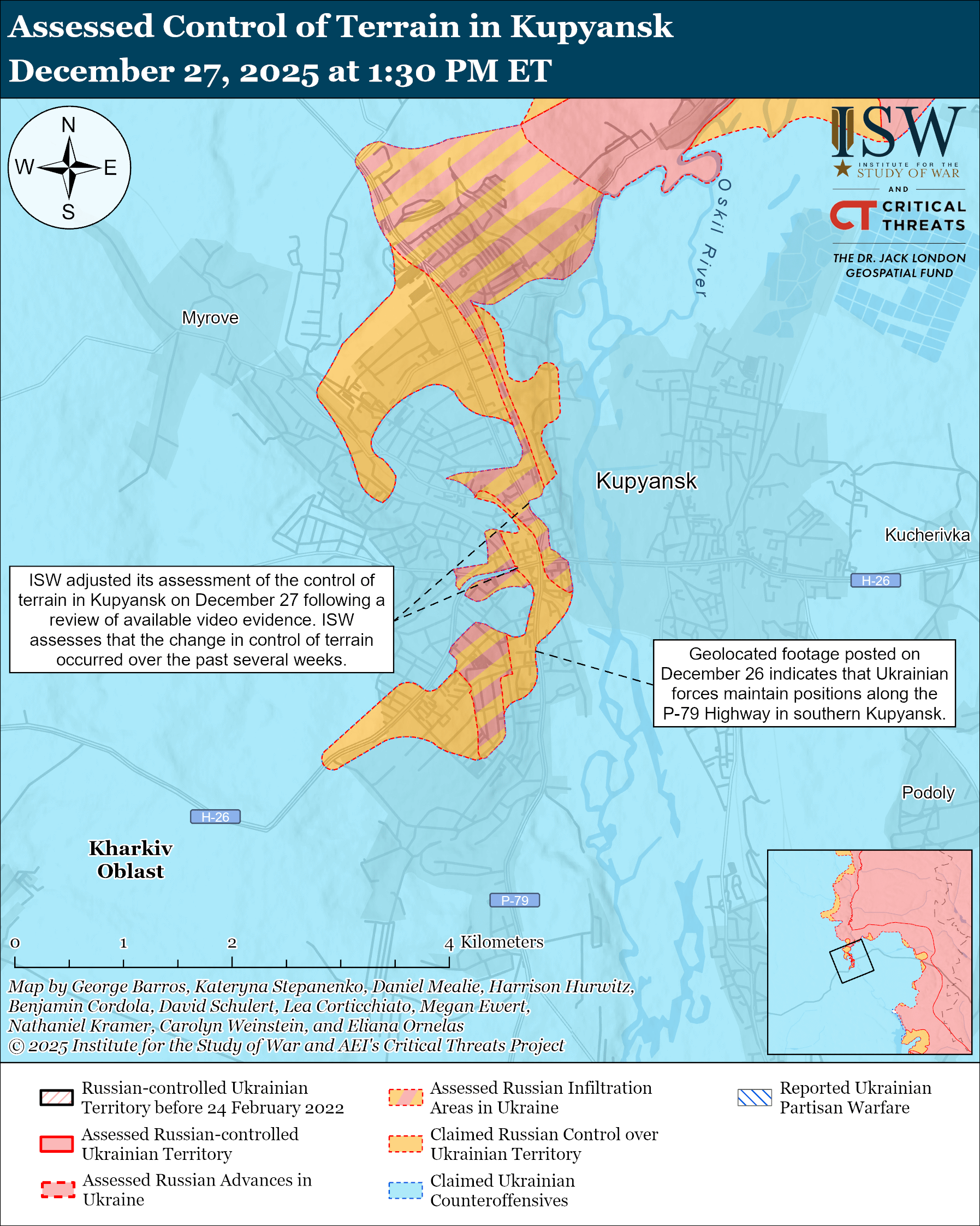 There is ample evidence to indicate that Ukrainian forces have liberated most of Kupyansk, however. Geolocated footage published on December 16, 20, and 26 indicates that Ukrainian forces recently advanced along the P-07 Kupyansk-Shevchenkove highway and the P-79 Kupyansk-Chuhuiv highway in central Kupyansk.[27] ISW has observed ample geolocated footage in recent weeks indicating Ukrainian advances near and within Kupyansk — in line with statements from Ukrainian officials about Ukrainian successes in the area.[28] Russian milbloggers, including some who have traditionally been hesitant to criticize the Russian MoD, have engaged in an unusual discourse acknowledging Ukraine's successes and aggressively blaming the MoD for lying about Russian advances.[29] Select Russian milbloggers have tried to downplay or write off Ukrainian successes in the Kupyansk direction, which other milbloggers stated was "manipulative" and diverting attention away from the main problem at hand — the systemic culture of lying in the Russian military.[30] The Russian MoD is likely now doubling down on its efforts to cover up its failures in Kupyansk in order to not weaken Russia's position in the ongoing peace talks with the United States. The scale of available open-source evidence of Ukrainian advances in the Kupyansk direction, coupled with the uncharacteristically high number of corroborating reports from Russian sources who do not typically discuss Ukrainian battlefield successes, seriously undermine the Kremlin's cognitive warfare effort that aims to paint a Russian military victory as inevitable and Ukrainian defenses on the verge of collapse.