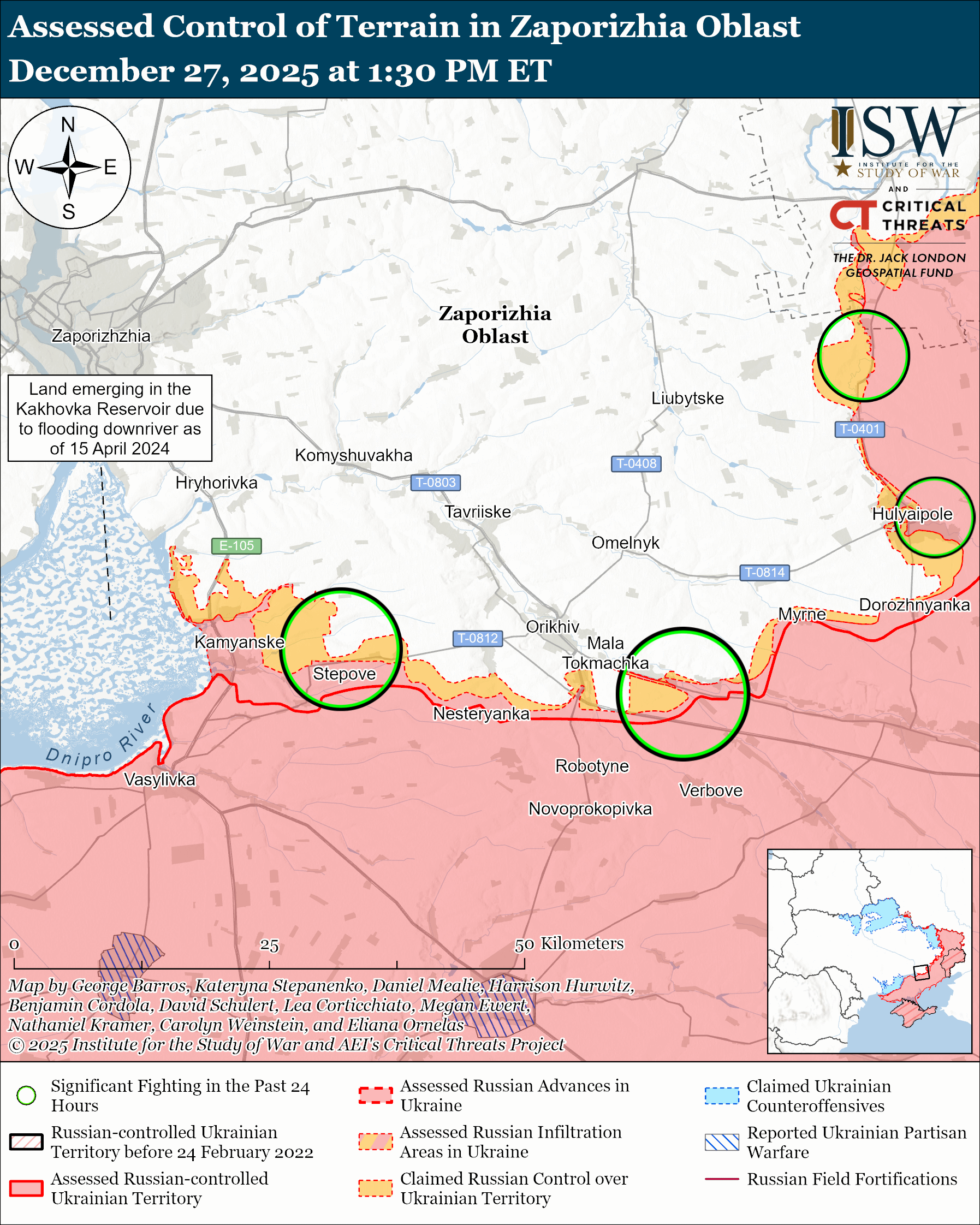 Assessed Russian advances: Geolocated footage published on December 26 indicates that Russian forces recently marginally advanced in central Hulyaipole.[81] Available video evidence and reports from Ukrainian military sources indicate that Russian forces also advanced north of Hulyaipole and that the Russian forward edge of battle area (FEBA) is further south in the fields north of Hulyaipole than ISW previously assessed.[82]