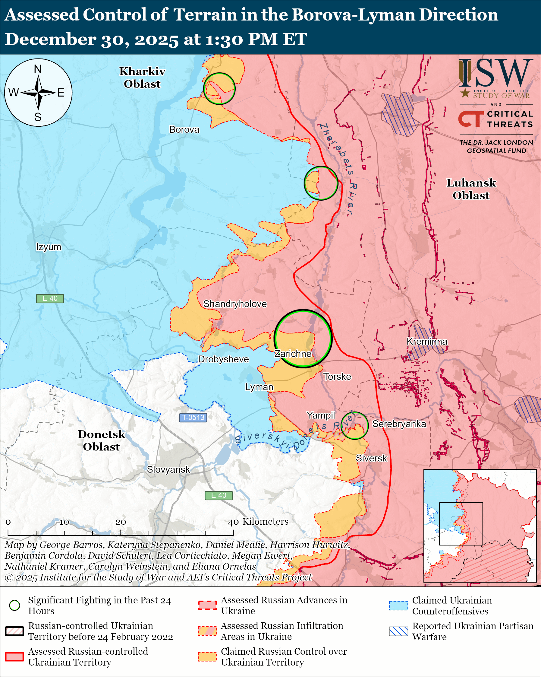 A Ukrainian brigade operating in the Siversk direction reported on December 30 that the situation in Dronivka is difficult, but Ukrainian forces maintain control of the settlement.[60] The Ukrainian brigade reported that Russian forces attempt to reach Dronivka by crossing the Siverskyi Donets River from Yampil (west of Dronivka) and the Serebryanske forest area to the west and northwest almost daily.[61] The Ukrainian brigade reported that Russian forces are also attempting to reach Dronivka from the southeast by conducting small-group raids from Siversk. A Russian milblogger claimed that central Zakitne is a contested "gray zone."[62]