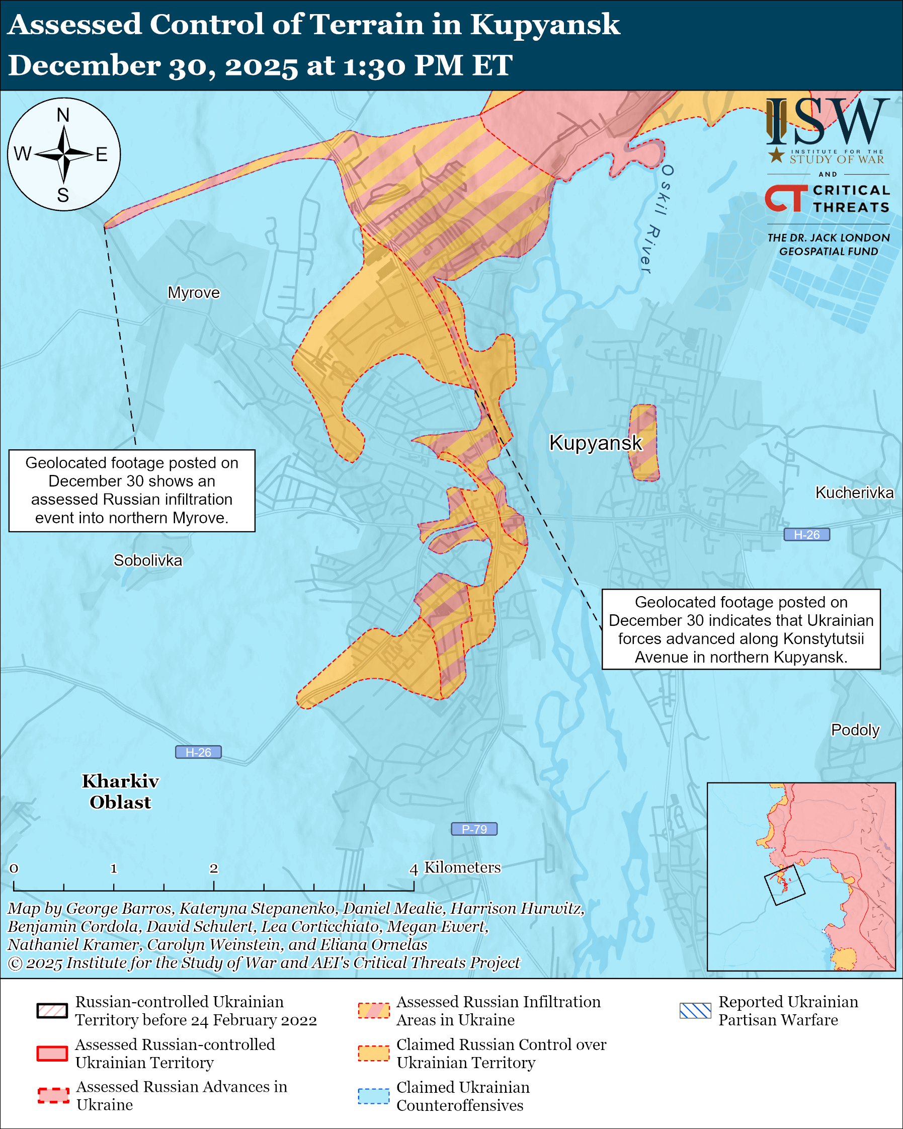 Assessed Russian infiltration: Geolocated footage published on December 30 shows four Russian servicemembers operating in northwestern Myrove (west of Kupyansk) during what ISW assess was a Russian infiltration mission that did not change the control of terrain or the forward edge of battle area (FEBA) at this time.[43]