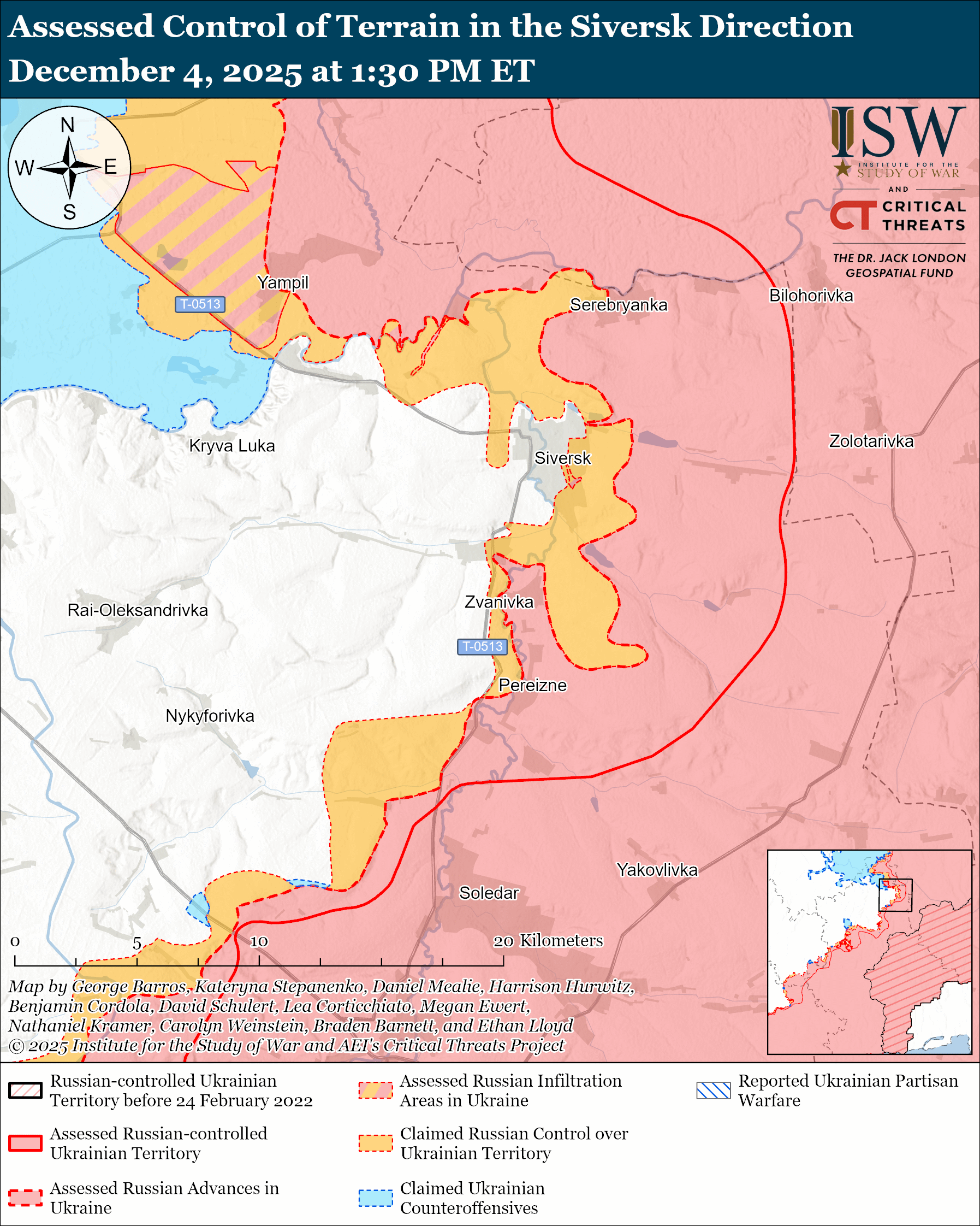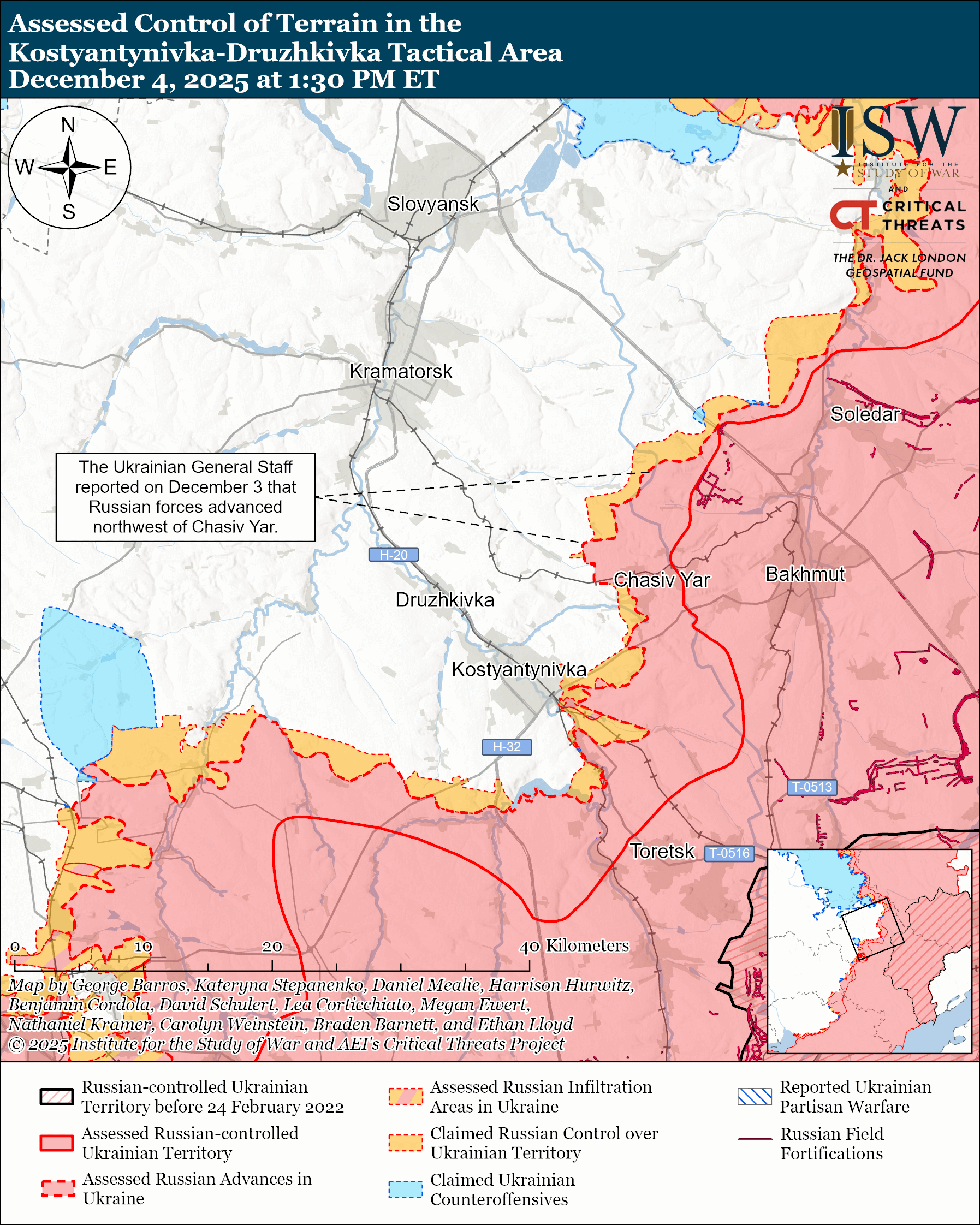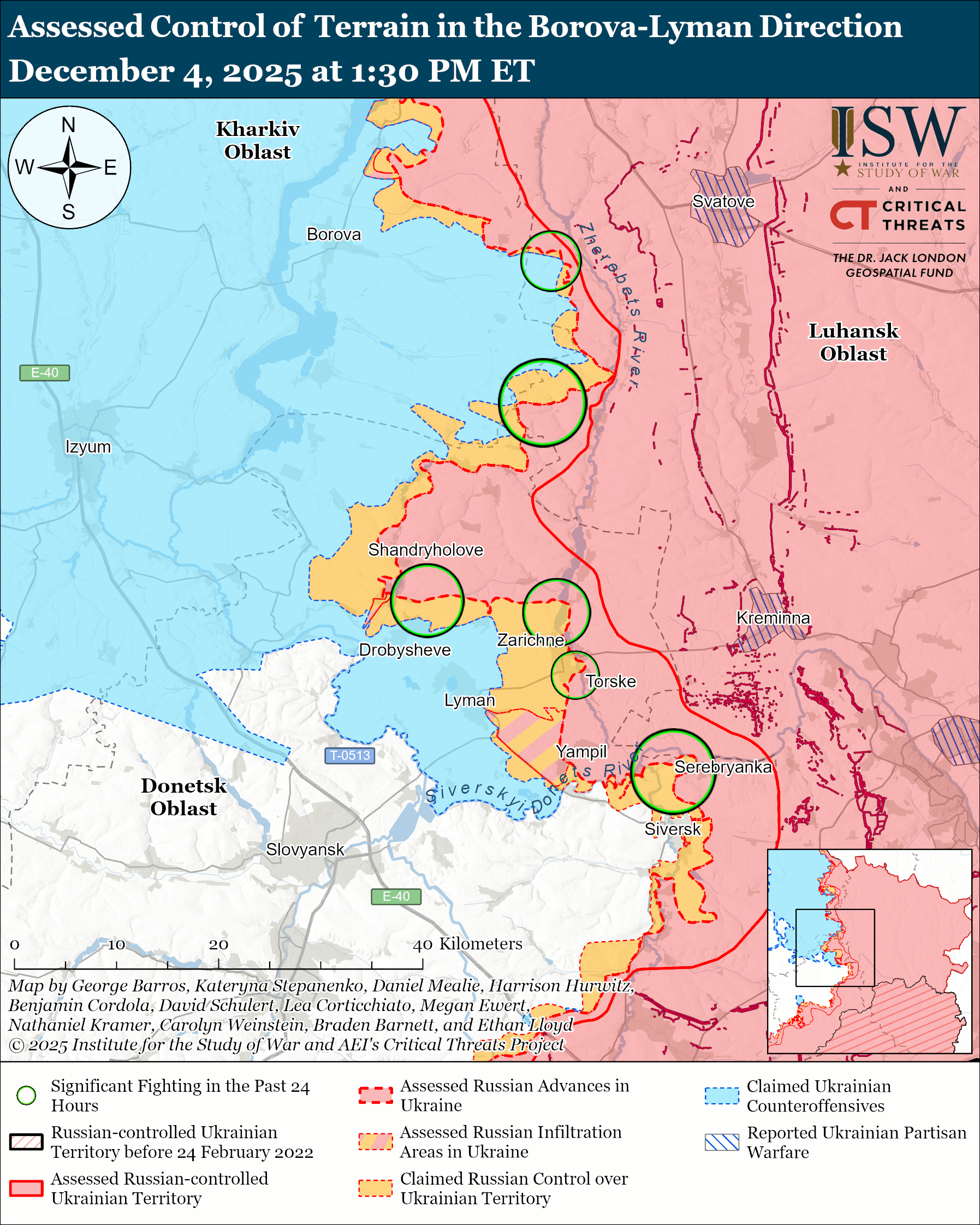 Russian forces attacked within and near Siversk; northwest of Siversk near Dronivka and Yampil; northeast of Siversk near Serebryanka; and south of Siversk near Svyato-Pokrovske on December 3 and 4.[lxi]