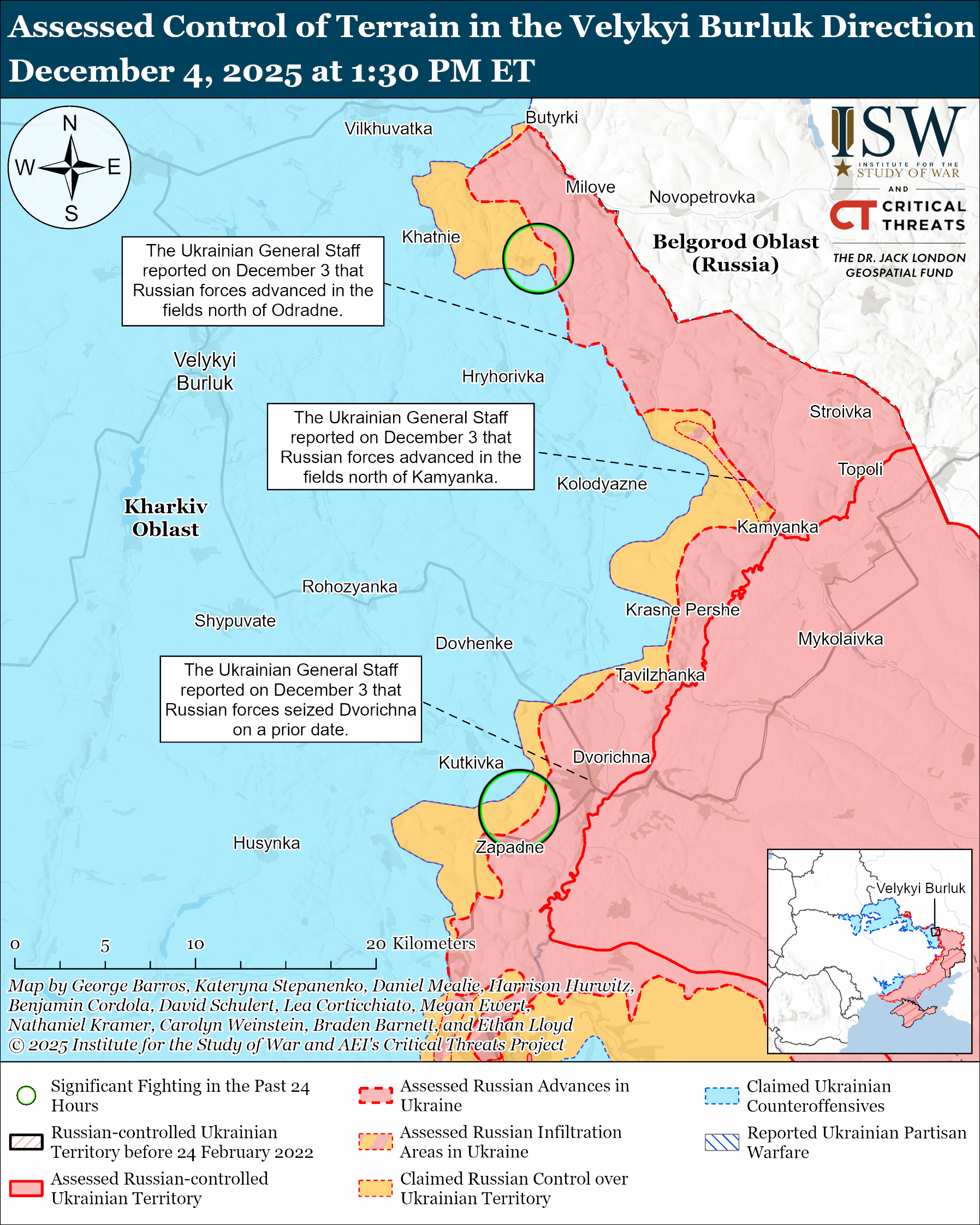 Assessed Russian advances: The Ukrainian General Staff published a map on December 3 showing that Russian forces advanced north of Odradne and east of Hryhorivka (both east of Velykyi Burluk) and north of Kamyanka and east of Dvorichanske (both southeast of Velykyi Burluk).[xlv]