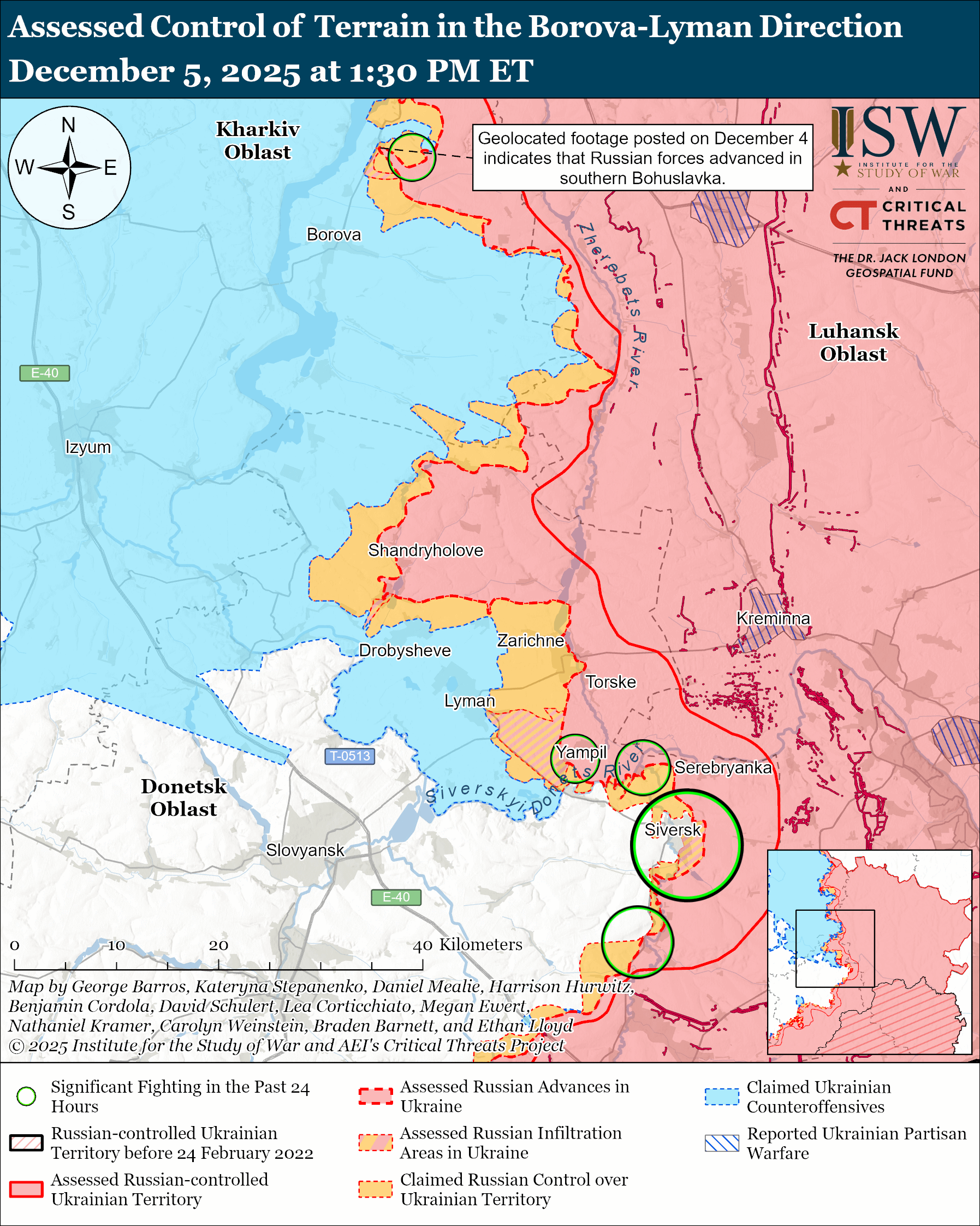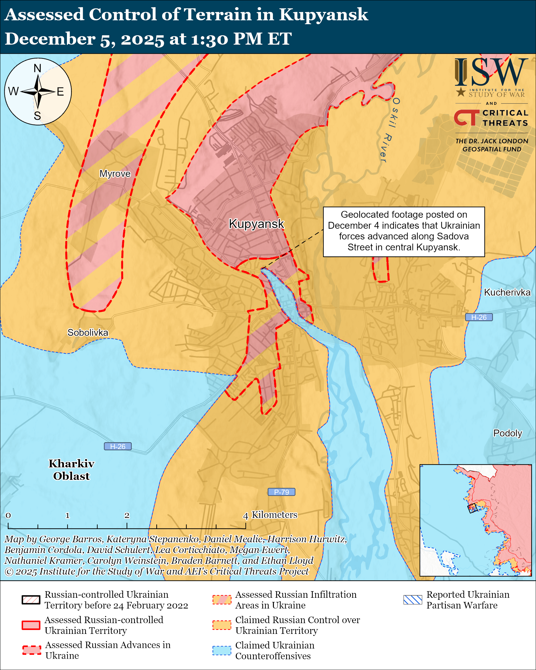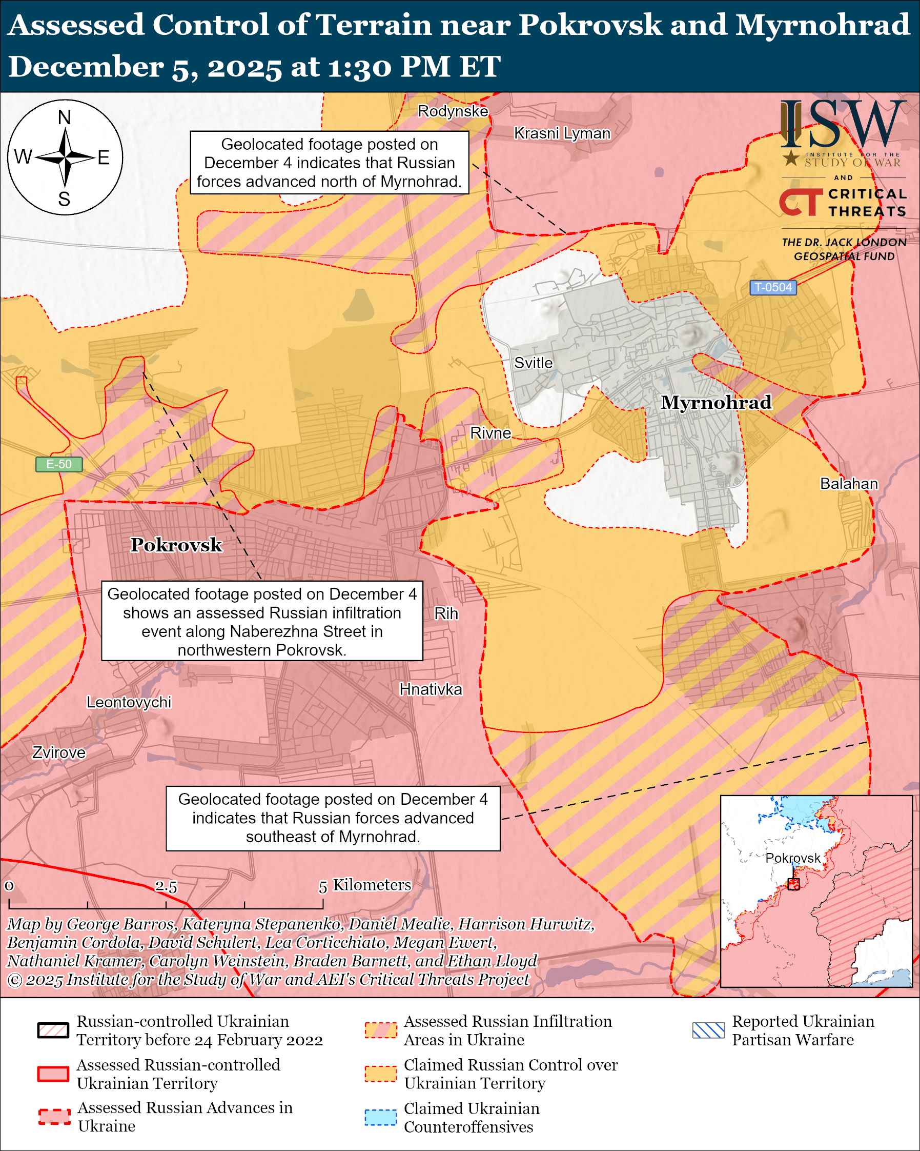 Available open-source information indicates that Russian forces have not encircled Ukrainian forces in Myrnohrad as of December 5 as Russian forces continue efforts to complete the encirclement of the Pokrovsk-Myrnohrad pocket. Geolocated footage published on December 4 indicates that Russian forces recently advanced north and southeast of Myrnohrad (east of Pokrovsk.[5] Additional geolocated footage published on December 4 indicates that Russian forces also infiltrated into positions in northwestern Pokrovsk.[6] These geolocations are not yet dispositive that Russian forces have achieved a complete land encirclement of Ukrainian forces in the Pokrovsk-Myrnohrad pocket, however. Commander of the Ukrainian 7th Rapid Reaction Corps of the Air Assault Forces, Commander Brigadier General Yevhen Lasiychuk, reported on December 5 that Russian forces have not encircled the Pokrovsk-Myrnohrad pocket and that Ukrainian forces hold northern Pokrovsk and maintain positions in central Pokrovsk.[7] Lasiychuk noted that Russian forces are avoiding urban warfare and are instead attempting to bypass Pokrovsk from its flanks. ISW continues to assess that Russian forces will very likely complete the seizure of Pokrovsk and Myrnohrad after a 21-month campaign, though the timing and operational implications of these seizures remain unclear at this time.[8] Although ISW has not observed visual evidence or official Ukrainian reports to assess that Russian forces have encircled Ukrainian forces in Myrnohrad, the situation is likely extremely difficult, and Russian forces very likely can disrupt narrow Ukrainian exfiltration routes and ground lines of communication (GLOCs) with artillery and drones.