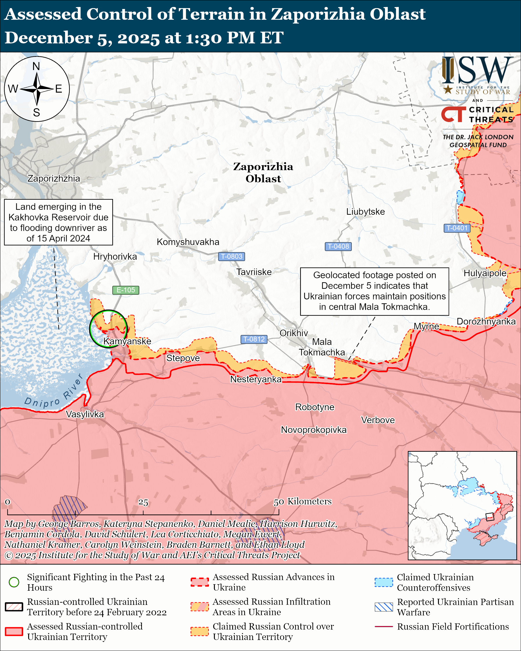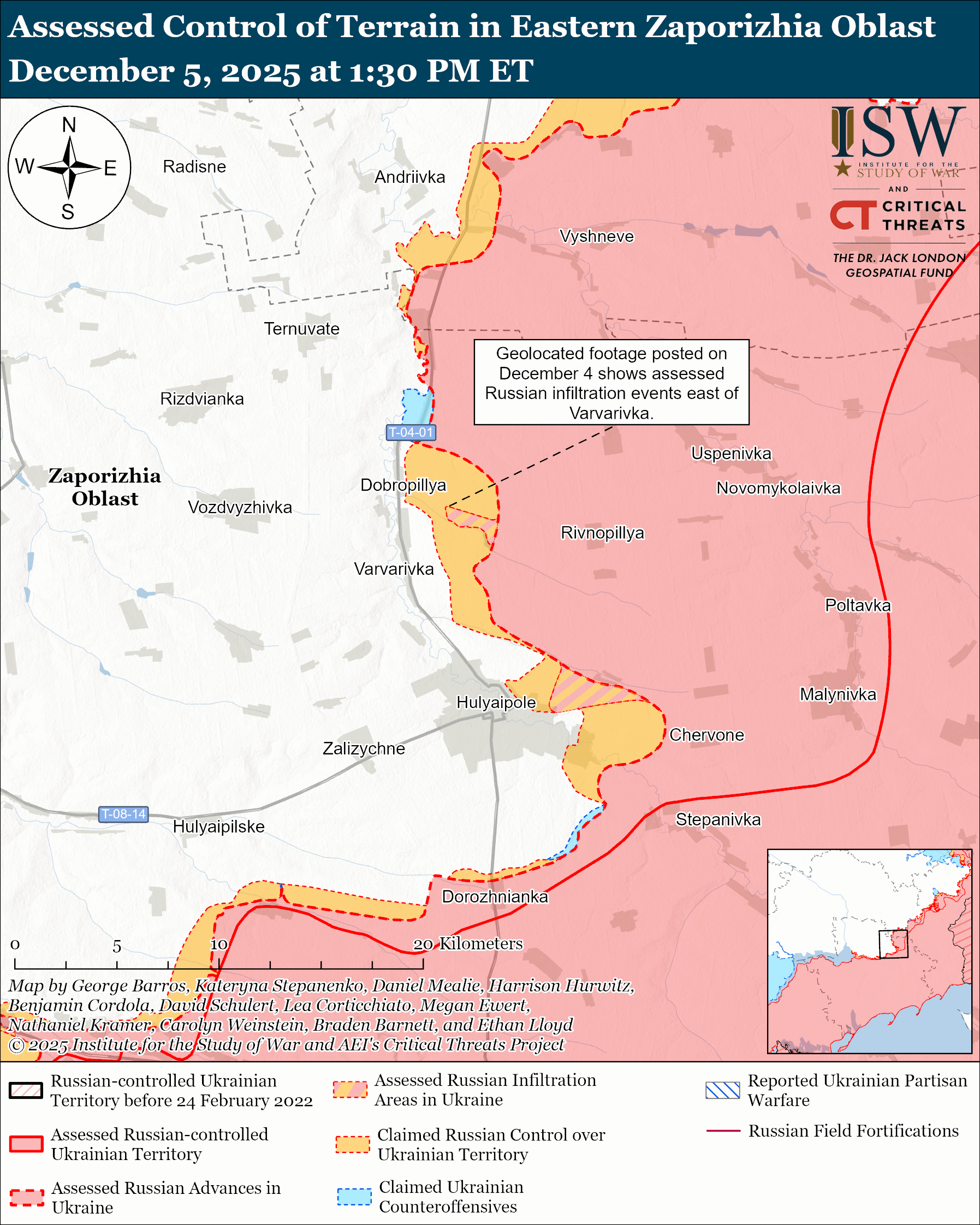 Assessed Russian infiltrations: Geolocated footage published on December 4 and 5 shows Ukrainian forces striking Russian positions east of Varvarivka (north of Hulyaipole) during what ISW assesses was a Russian infiltration mission that did not change control of terrain or the forward edge of the battle area (FEBA) at this time.[75]