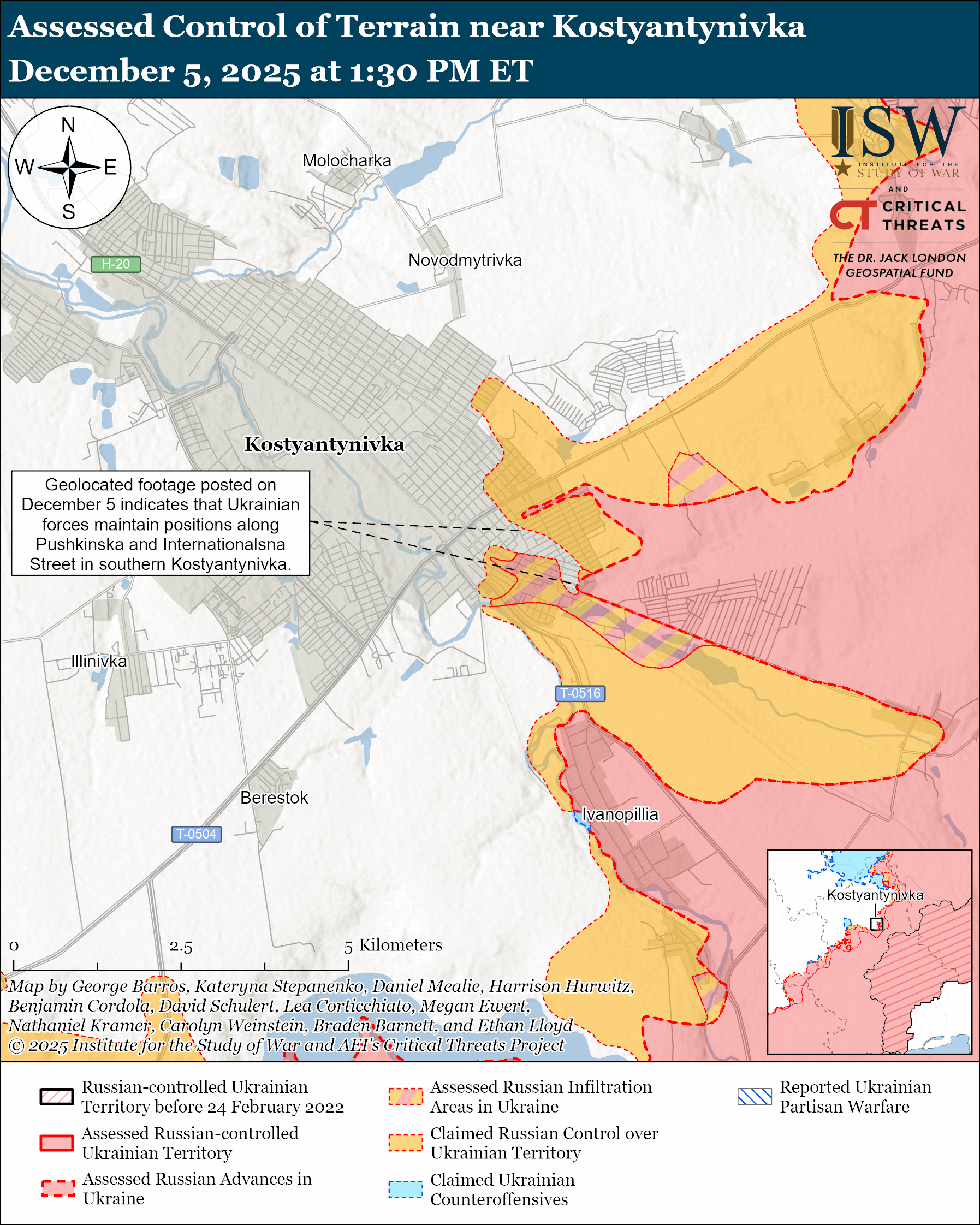 Russian forces continued offensive operations in the Kostyantynivka-Druzhkivka tactical area on December 5 but did not make confirmed advances.