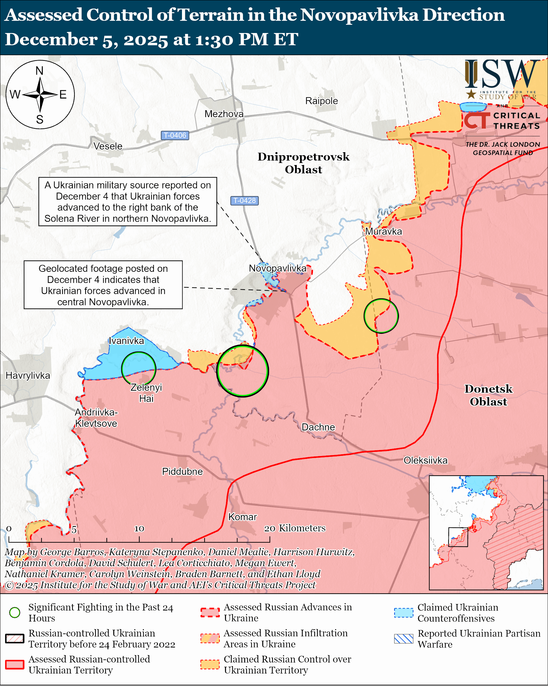 Refinement of areas under Russian claims: A Ukrainian brigade operating in the Novopavlivka direction reported on December 4 that Ukrainian forces cleared Novopavlivka of Russian forces, indicating that Russin forces at least no longer maintain a presence on the west (right) bank of the Solena River in Novopavlivka, areas where Russian sources previously claimed that Russian forces maintained a presence.[70] ISW has not observed open-source evidence to confirm that Ukrainian forces completely liberated Novopavlivka on the east (left) bank of the Solena River, though it is possible. ISW will continue to update its assessment as it collects and verifies more information.