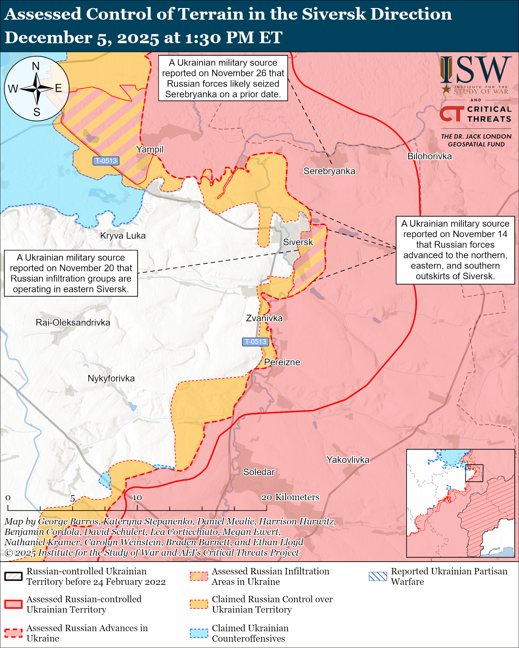 Assessed Russian advances: A Ukrainian military source published maps on November 14 and November 26 showing that Russian forces seized Serebryanka (northeast of Siversk) and advanced north, east, and southeast of Siversk, east of Dronivka (northwest of Siversk), northwest of Vyimka (southeast of Siversk), and east of Zvanivka (south of Siversk).[53] ISW has adjusted its control of terrain assessment on its maps accordingly after observing this evidence for the first time on December 5. ISW does not assess that these Russian gains occurred over the past 24 hours, despite only collecting evidence to assess the change now.