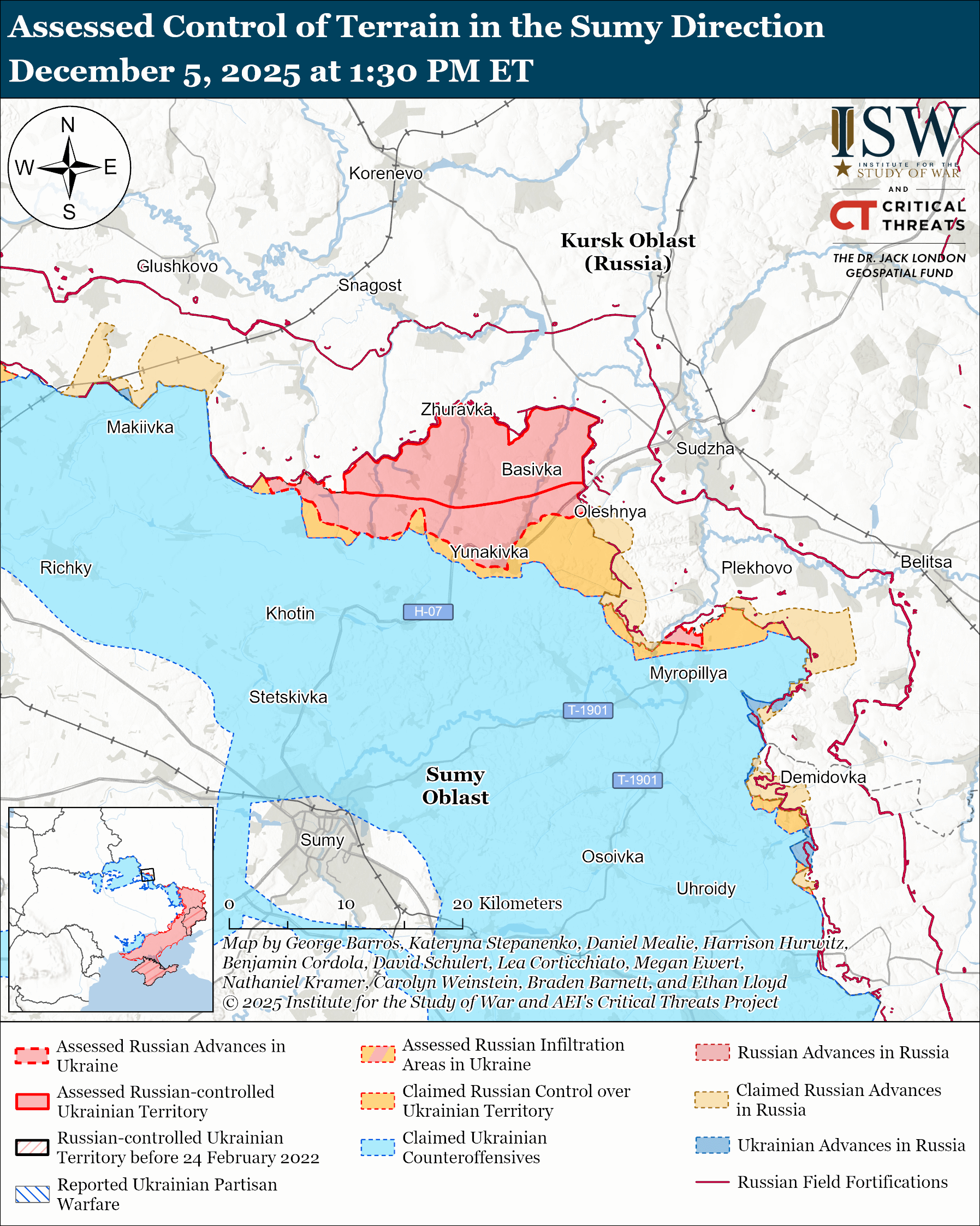 The spokesperson of a Ukrainian brigade operating in Sumy Oblast reported on December 5 that Russian forces are exploiting foggy weather conditions that degrade Ukrainian drone reconnaissance to assault Ukrainian positions in Sumy Oblast.[30] ISW has previously observed Russian forces leveraging poor weather conditions that hinder Ukrainian drone operations in northern Sumy Oblast.[31]