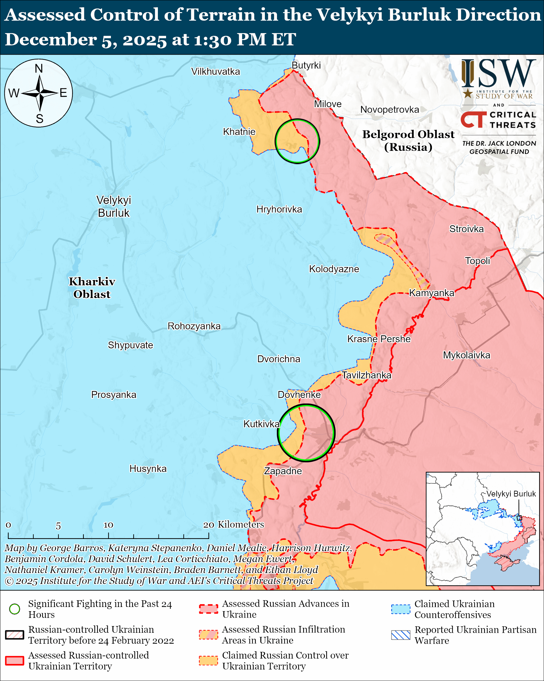 Russian forces continued offensive operations in the Velykyi Burluk direction on December 5 but did not make confirmed advances.