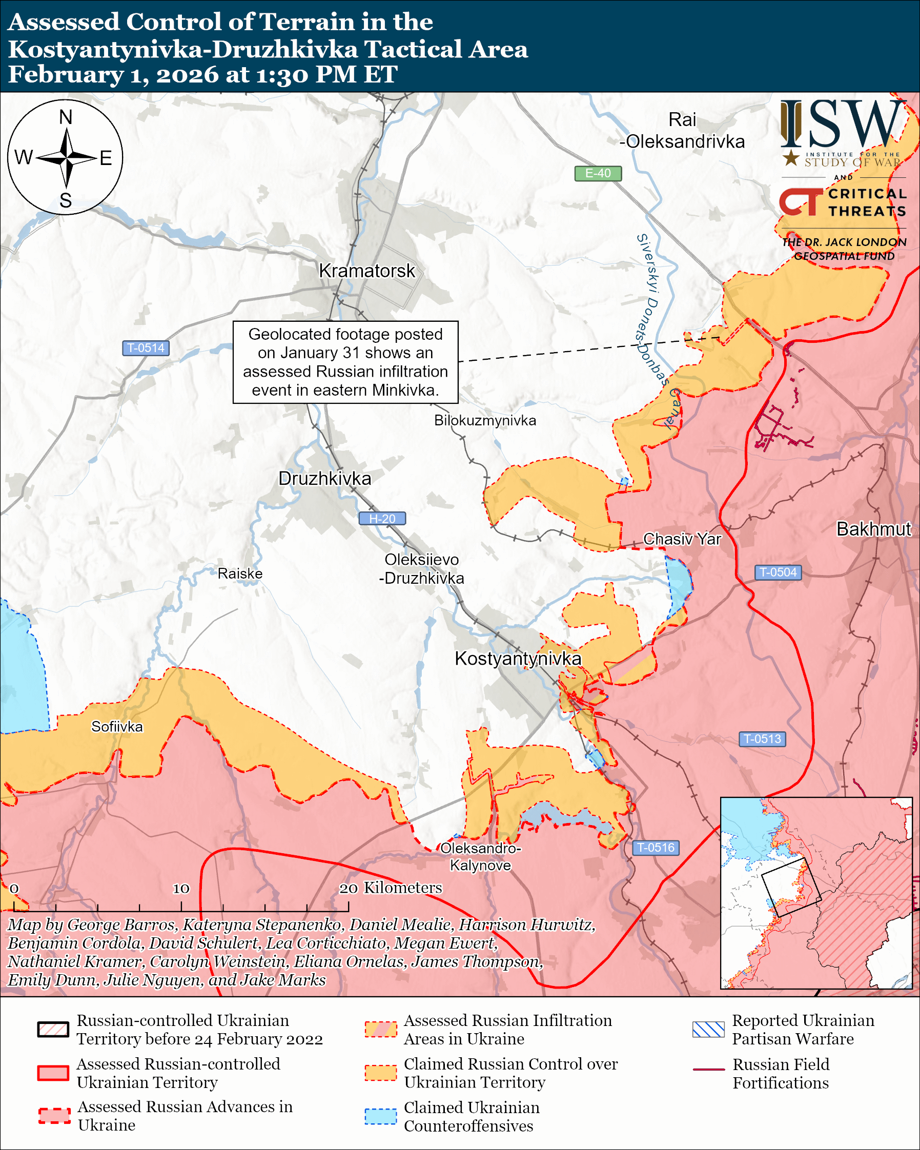Assessed Russian infiltrations: Geolocated footage published on January 31 shows Ukrainian forces striking a house in eastern Minkivka (northeast of Kostyantynivka) that Russian forces occupied after what ISW assesses was a Russian infiltration mission that did not change the control of terrain or the forward edge of battle area (FEBA).[lvii]
